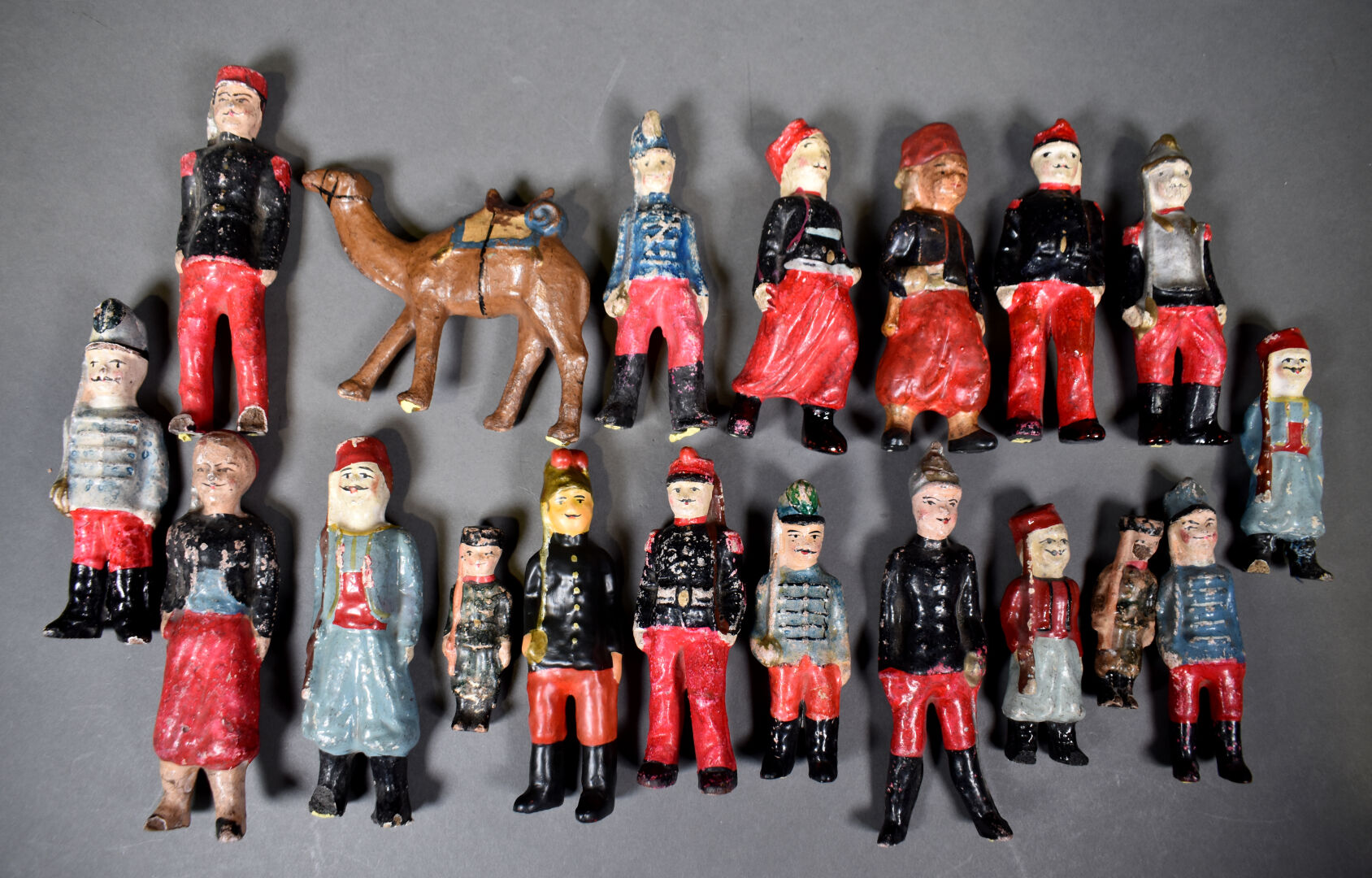 Figurines en composition type Bon Dufour en bel état d’usage avec quelques accidents circa 1900. 19 pièces dont un chameau de 18 à10 cm.