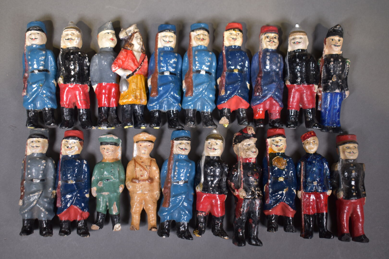 Figurines en composition type Bon Dufour en bel état d’usage avec quelques accidents circa 1900. 20 pièces de 10 à 12 cm.