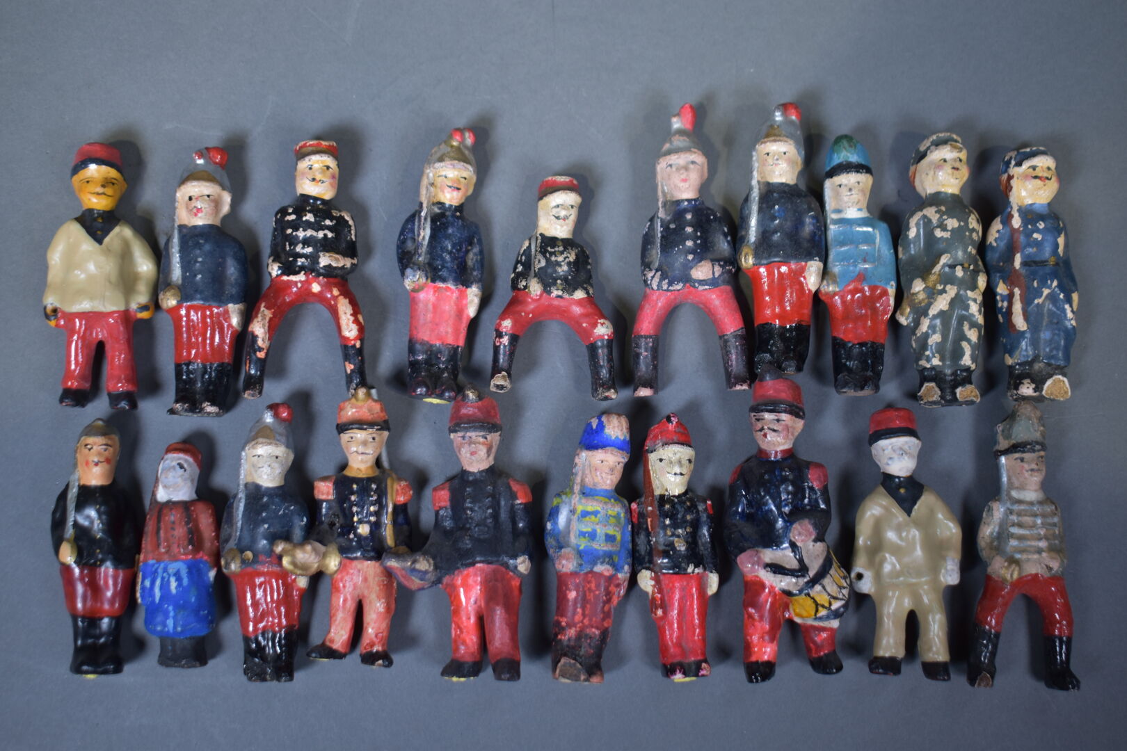 Figurines en composition type Bon Dufour en bel état d’usage avec quelques accidents circa 1900. 20 pièces de 8 à 10 cm.