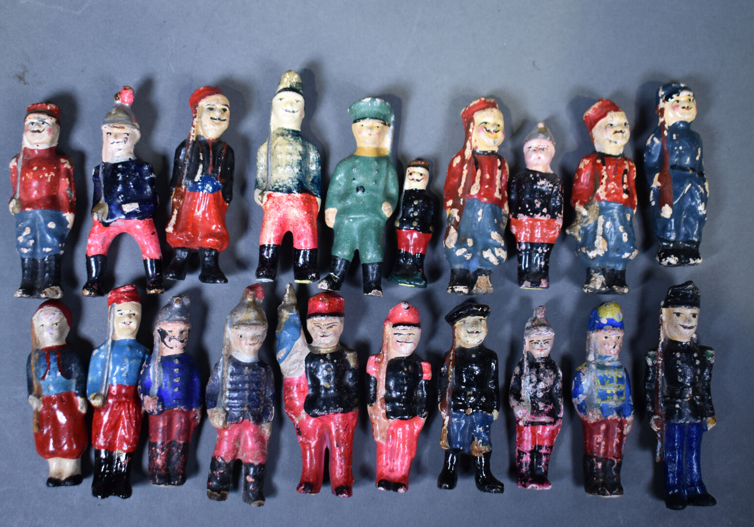 Figurines en composition type Bon Dufour en bel état d’usage avec quelques accidents circa 1900. 20 pièces de 8 à 10 cm.