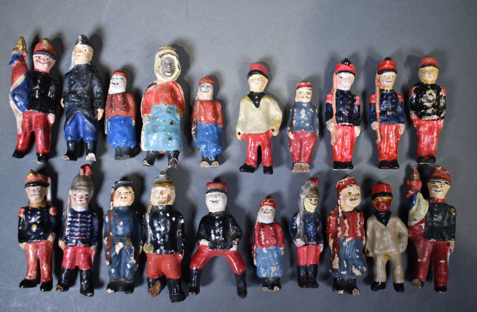Figurines en composition type Bon Dufour en bel état d’usage avec quelques accidents circa 1900. 20 pièces de 8 à 10 cm.