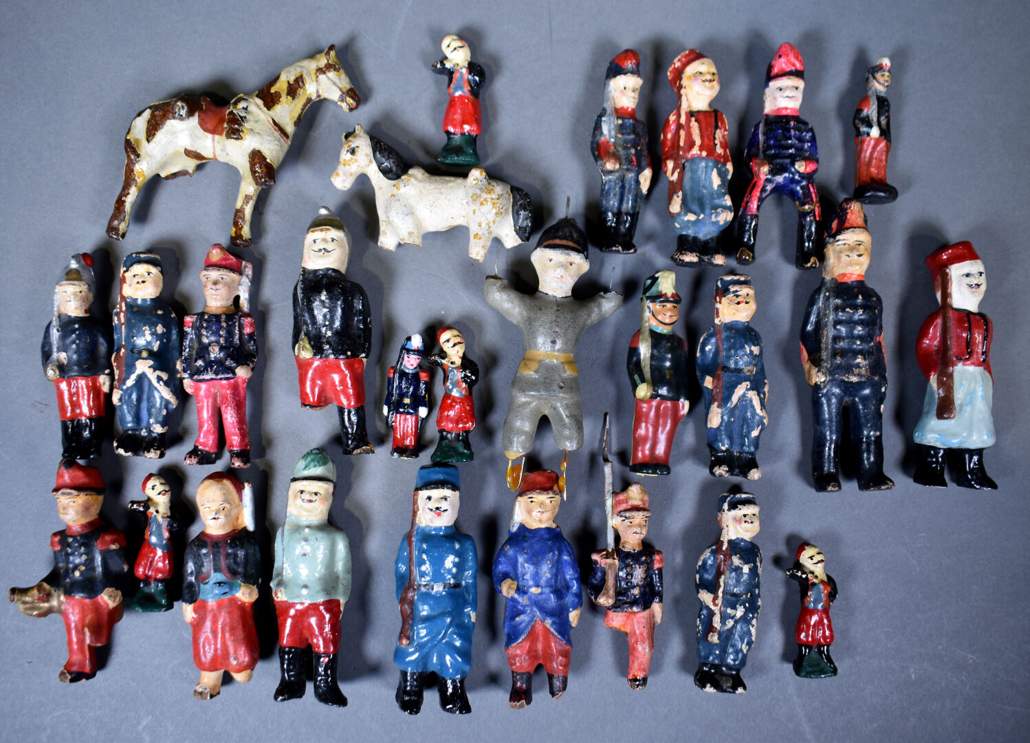 Figurines en composition type Bon Dufour en état d’usage et mauvais état avec quelques accidents circa 1900. 23 pièces de diverses tailles.