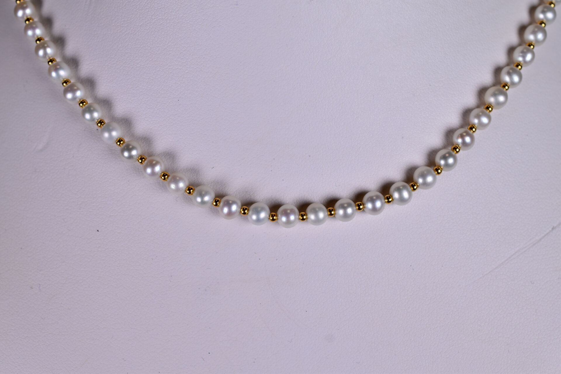 Fin collier de perles de culture d’eau douce choker alternées de petites billes d’or, fermoir en or 750/1000e. Long. : 41 cm. Poids brut. : 12 g.