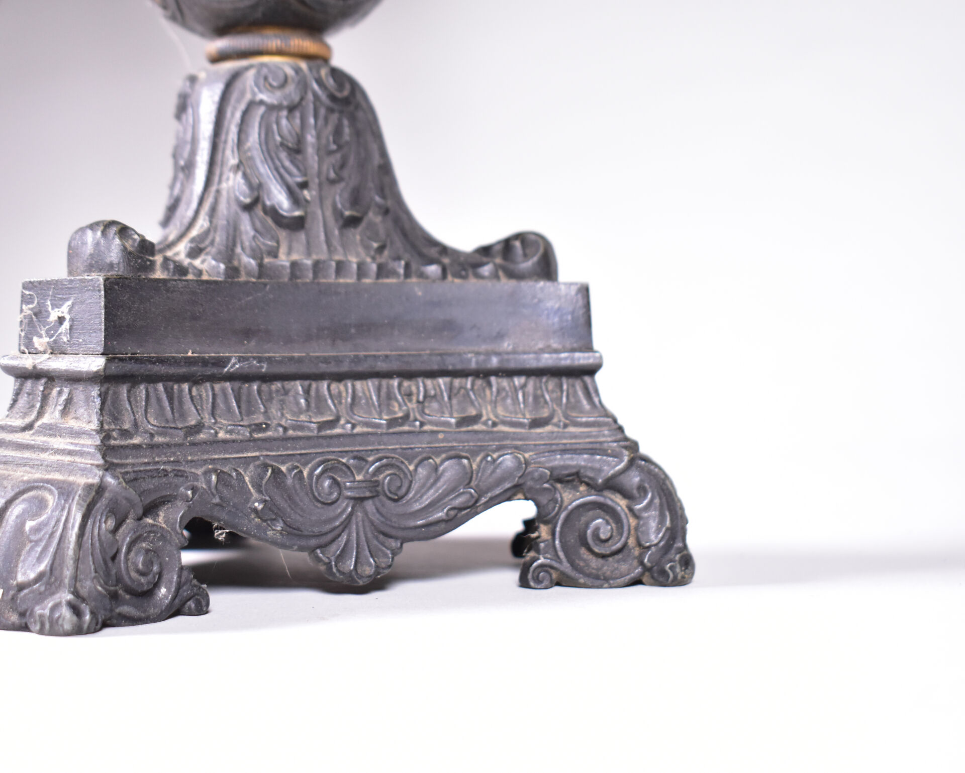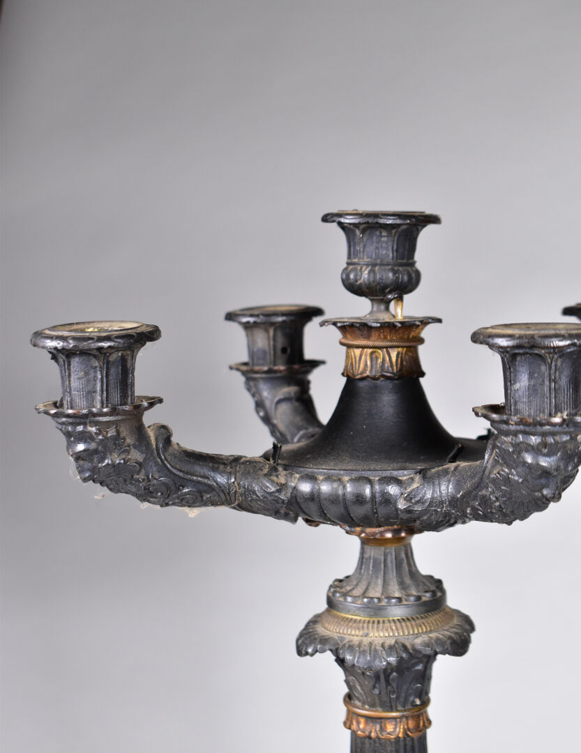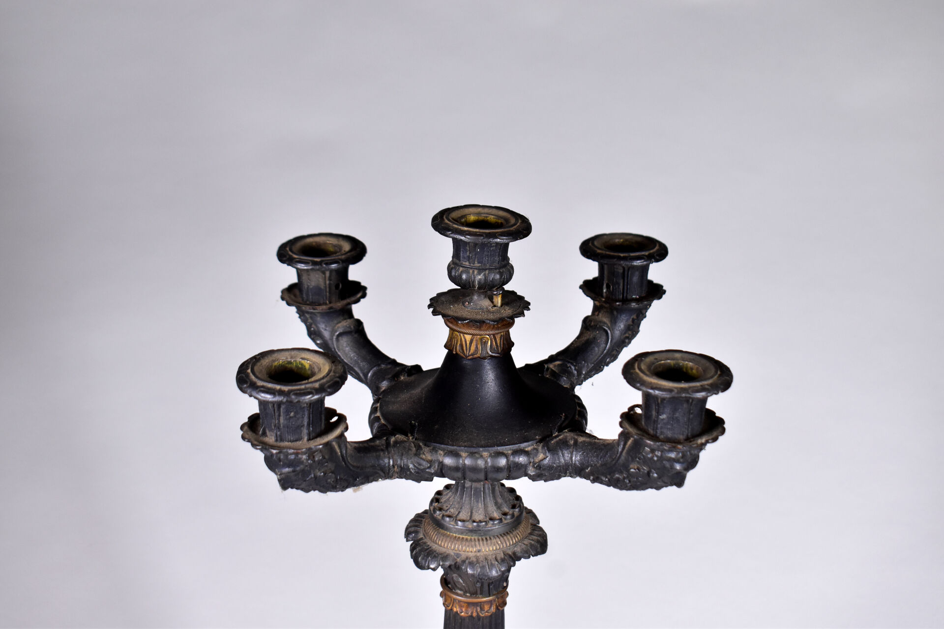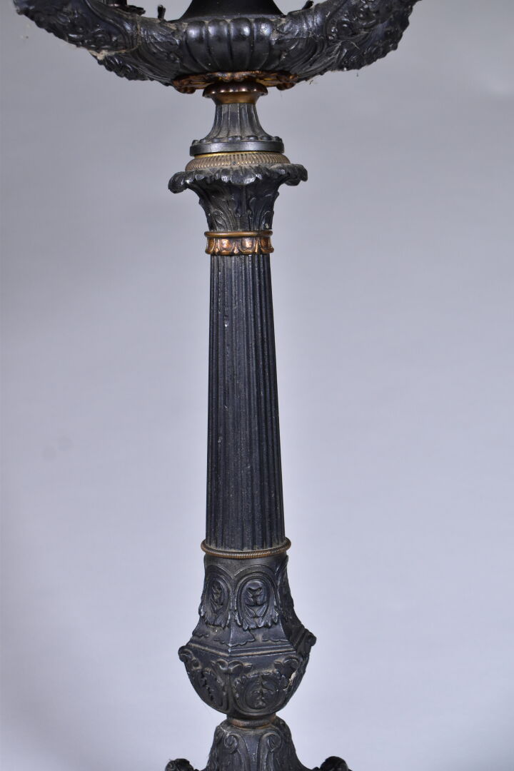 Flambeau en fonte ou métal blanc patiné noir et doré à 4 bras et 5 lumières. Seconde moitié du XIXe siècle. Anciennement électrifié. Haut. : 59 cm.