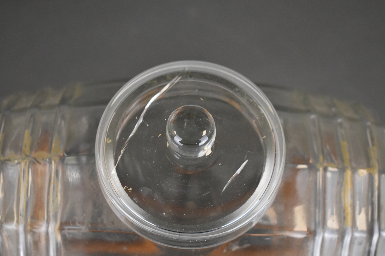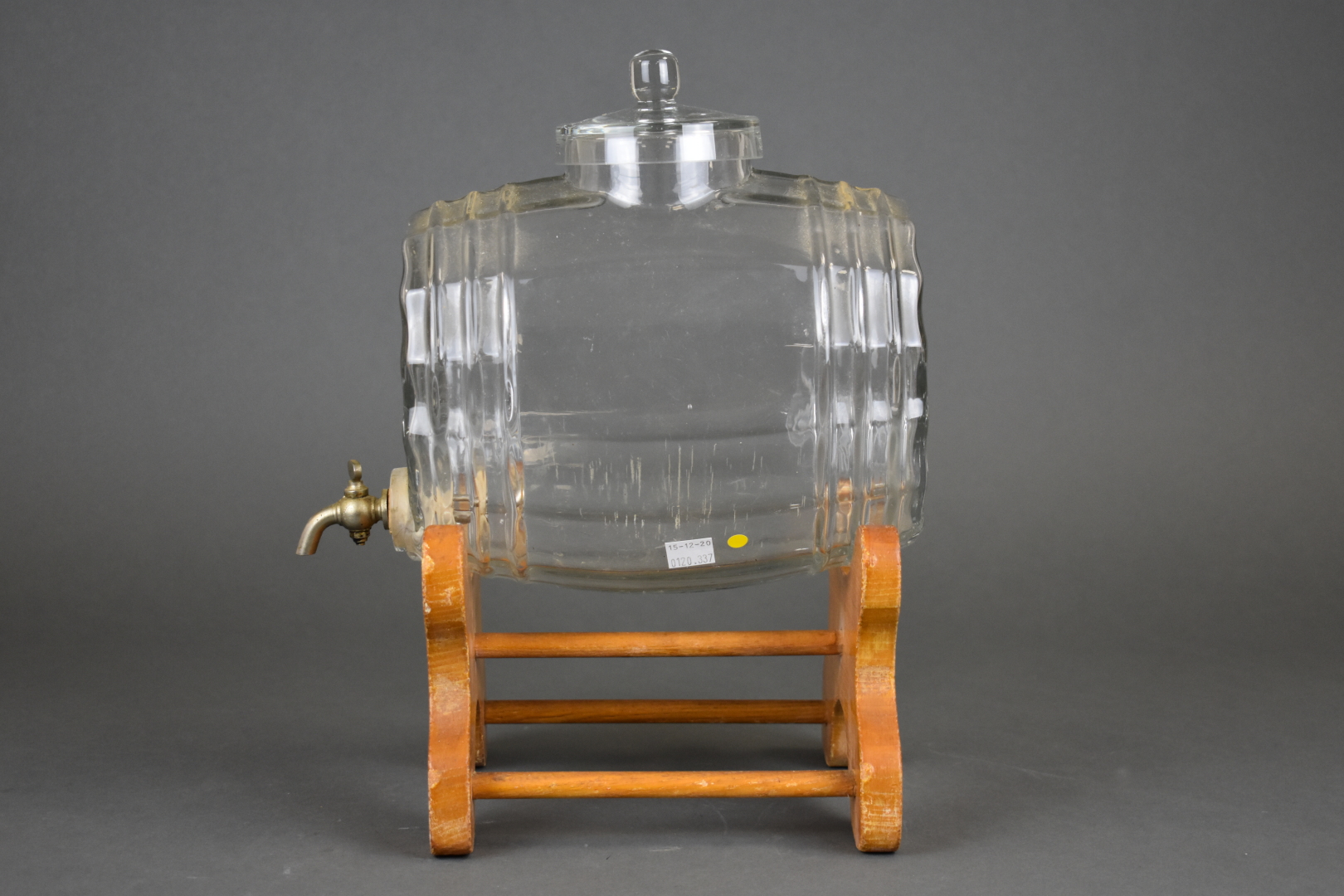 Fontaine à parfum en verre en forme de tonnelet (manque le bouchon). Socle de bois blond. Haut. totale : 34 cm.