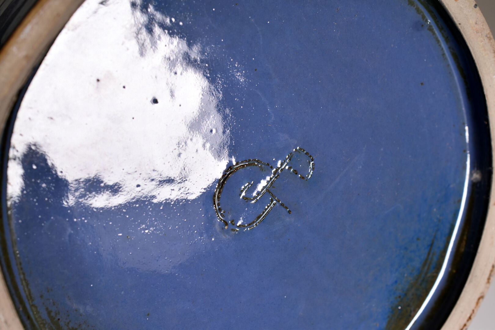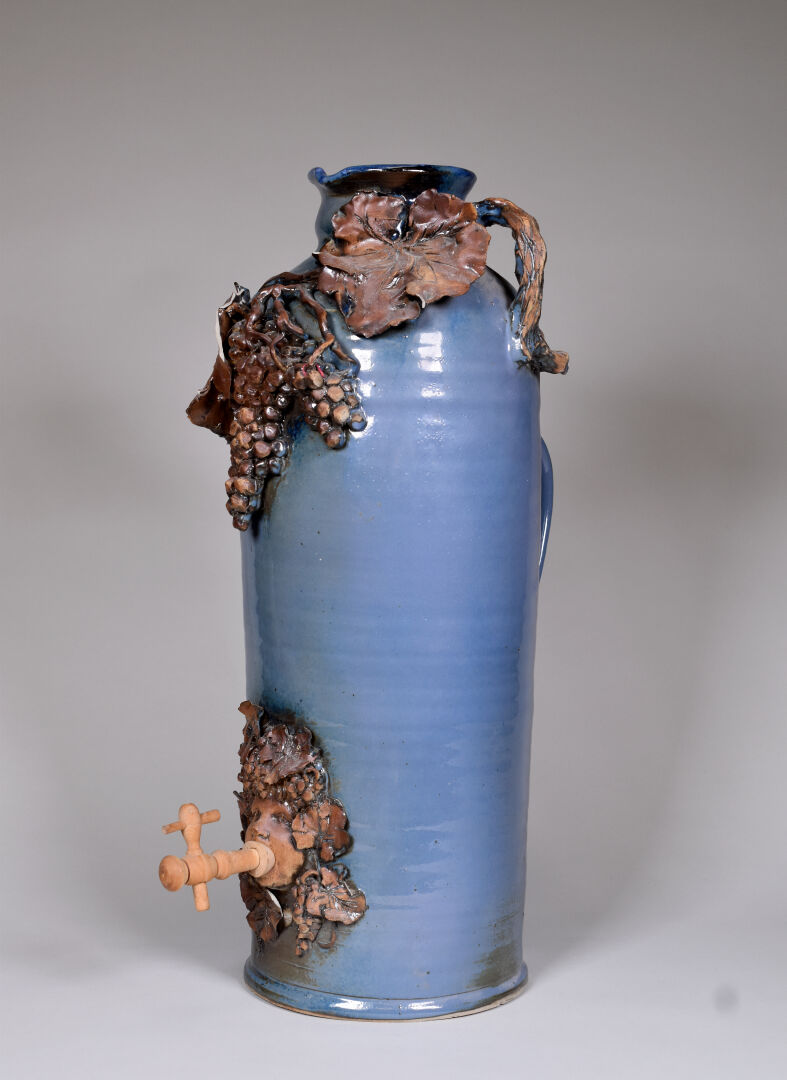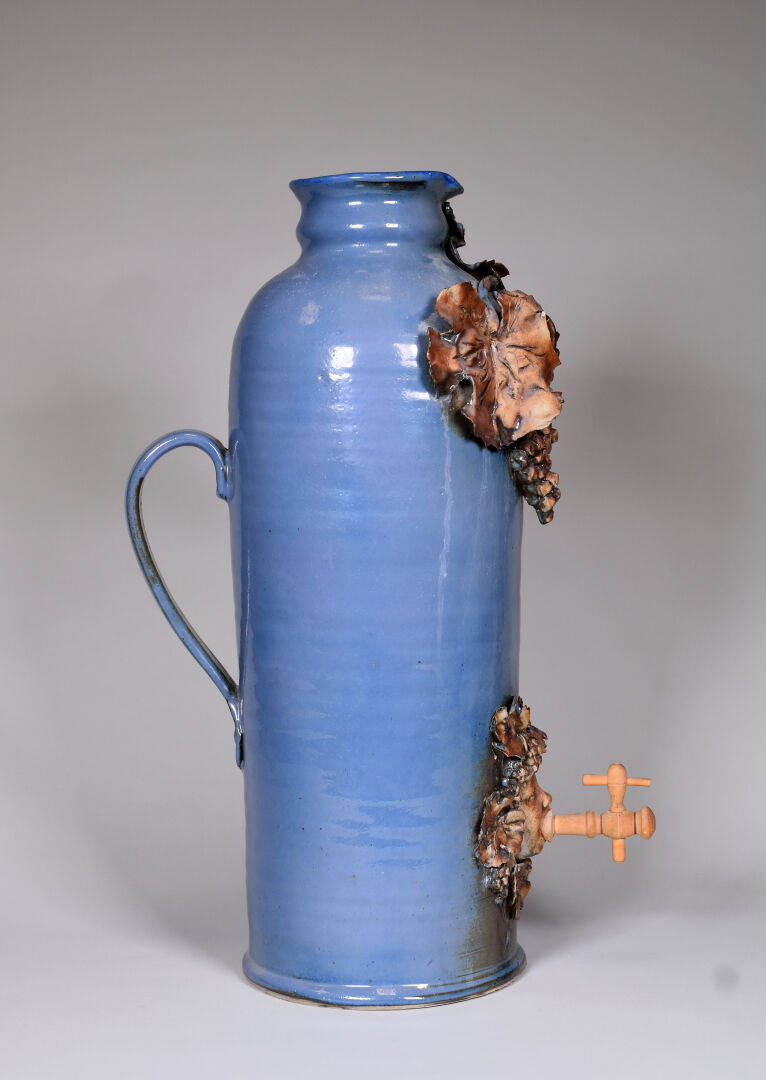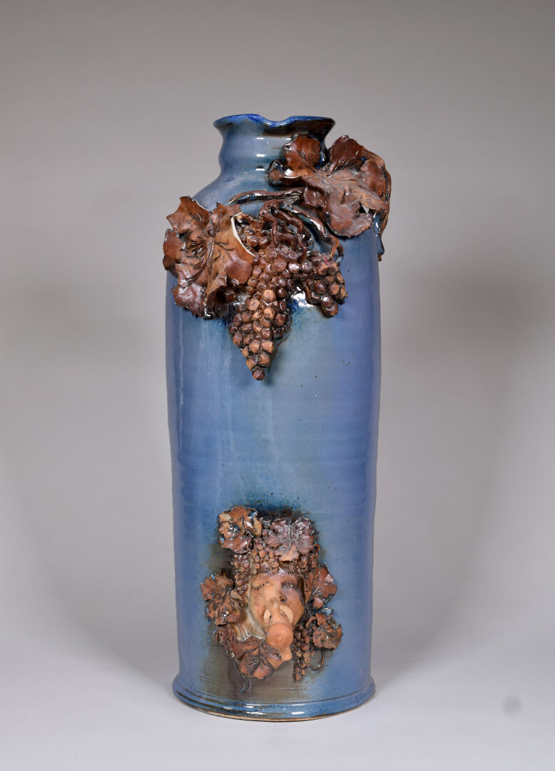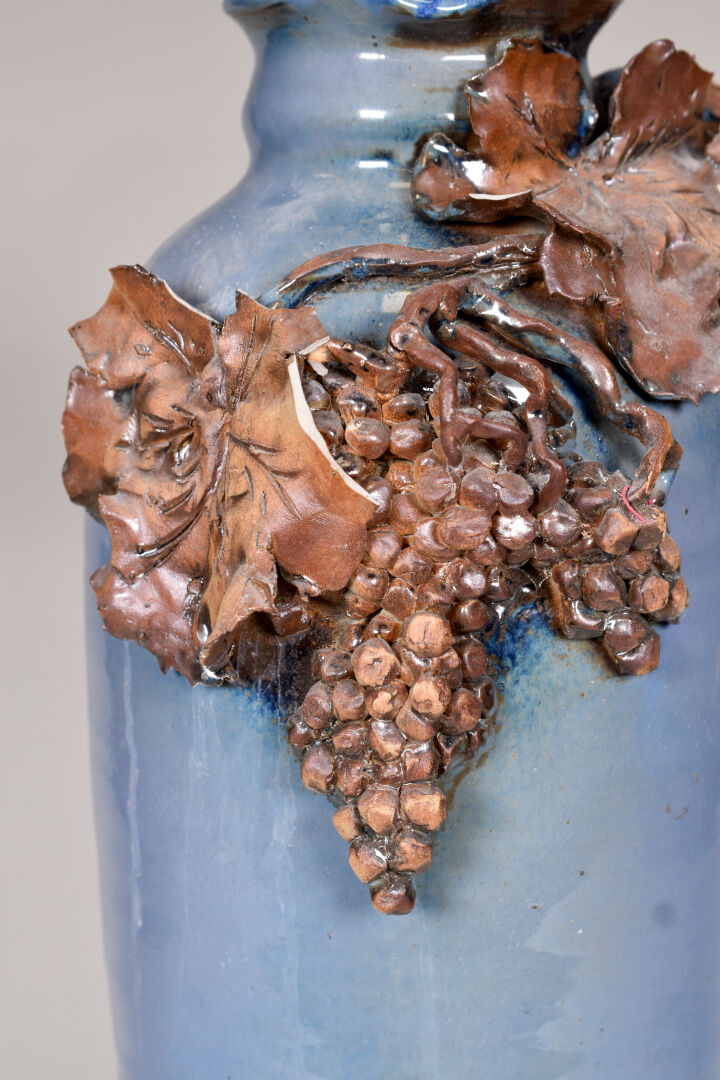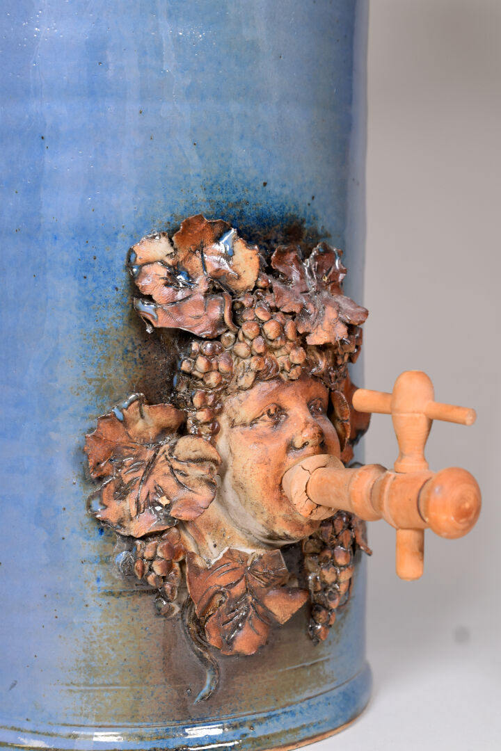 Fontaine en terre cuite émaillée bleu gris à décor en haut relief d’un mascaron de Bacchus et pampres de vigne (éclats). Monogrammée au dessous. XXe siècle. Haut. : 52 cm.
