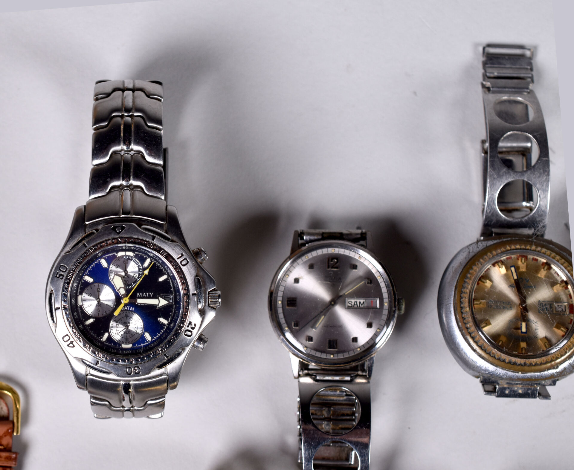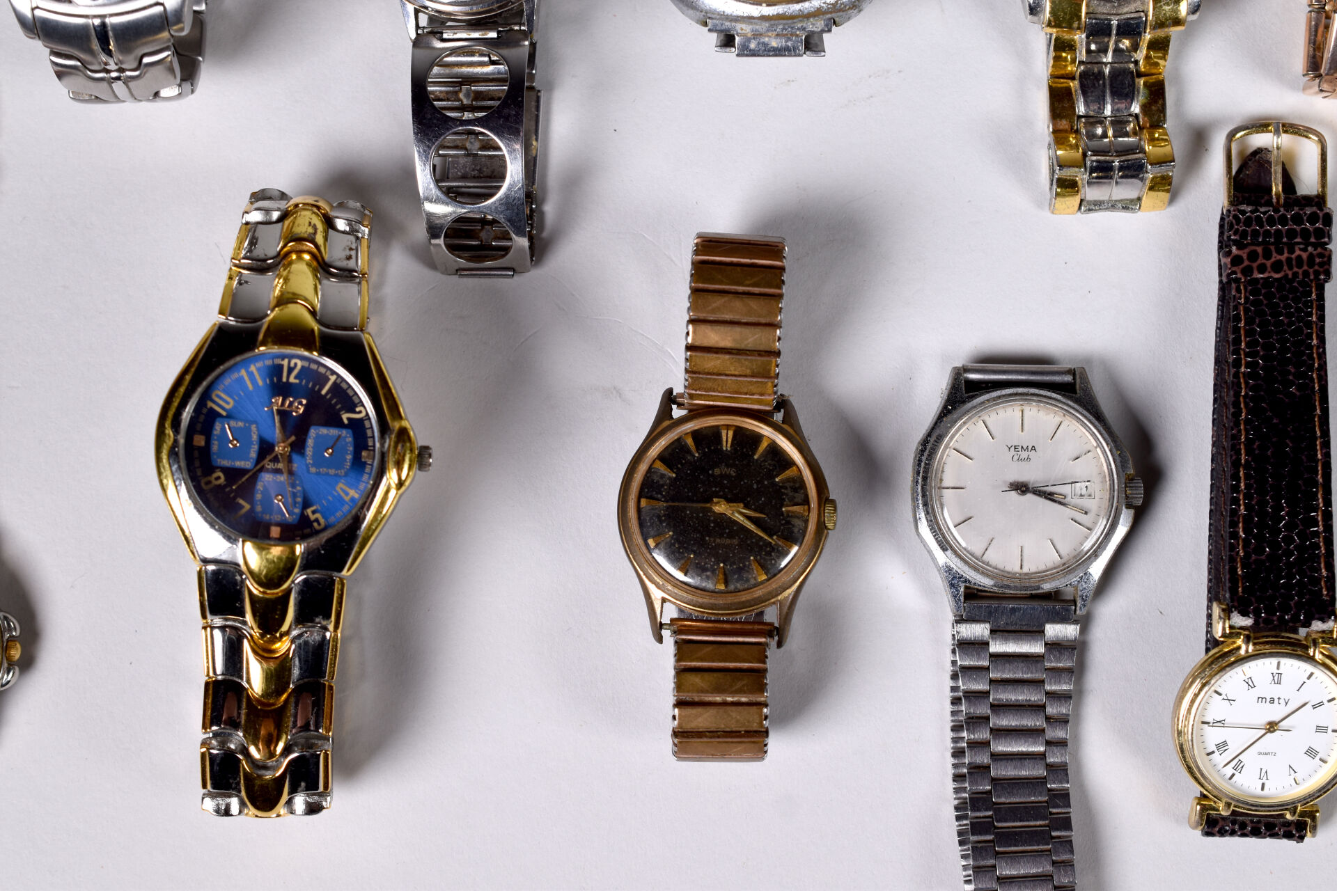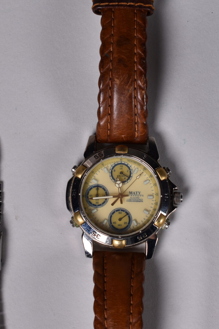 Fort ensemble de 26 montres bracelets dont LIP, YEMA, MATY (usures). On joint un ensemble de montre de gousset en métal ou argent.