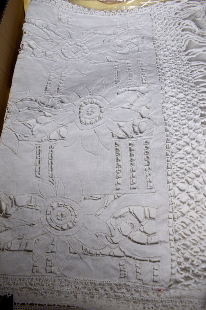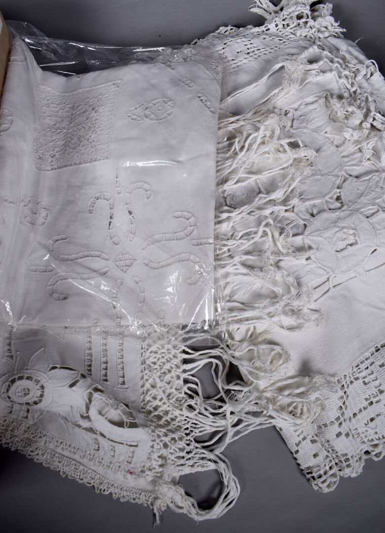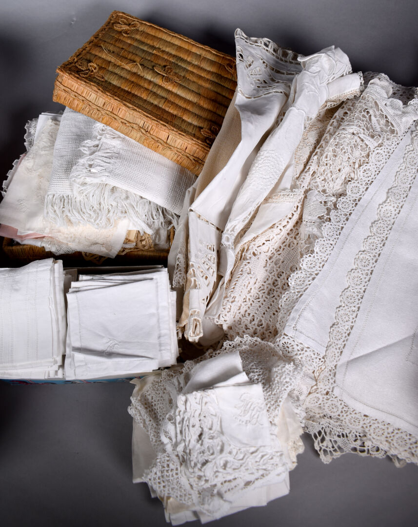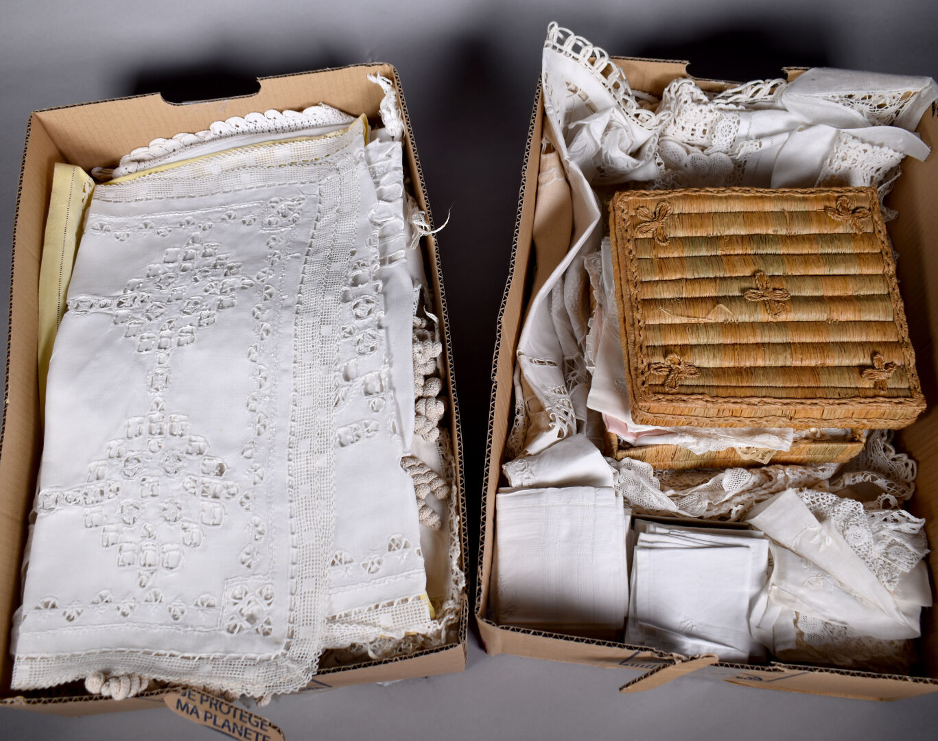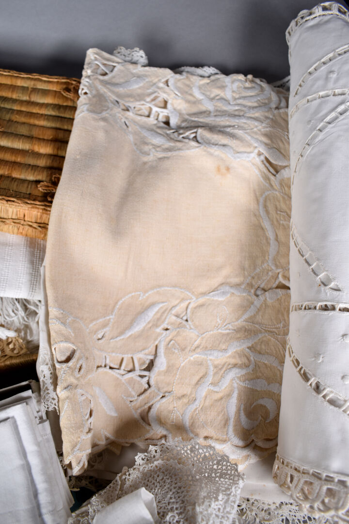 Fort ensemble de linge de maison dont carrés brodés, mouchoirs et carrés, napperons brodés, centres de tables et divers (quelques piqures).