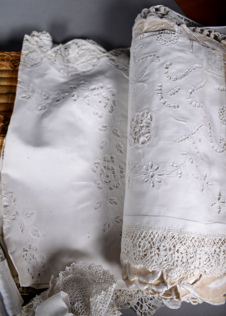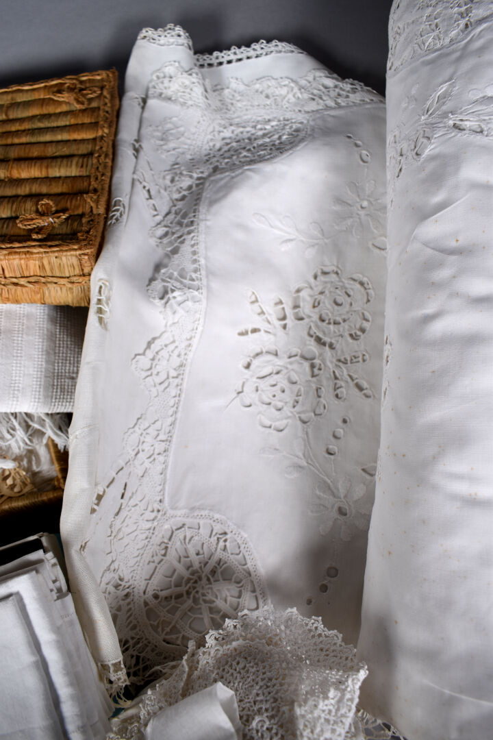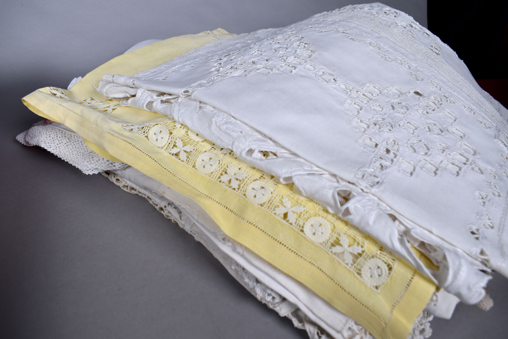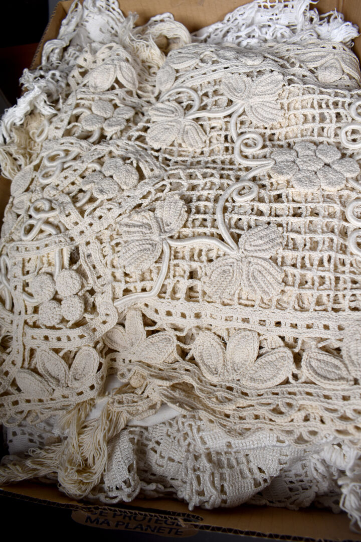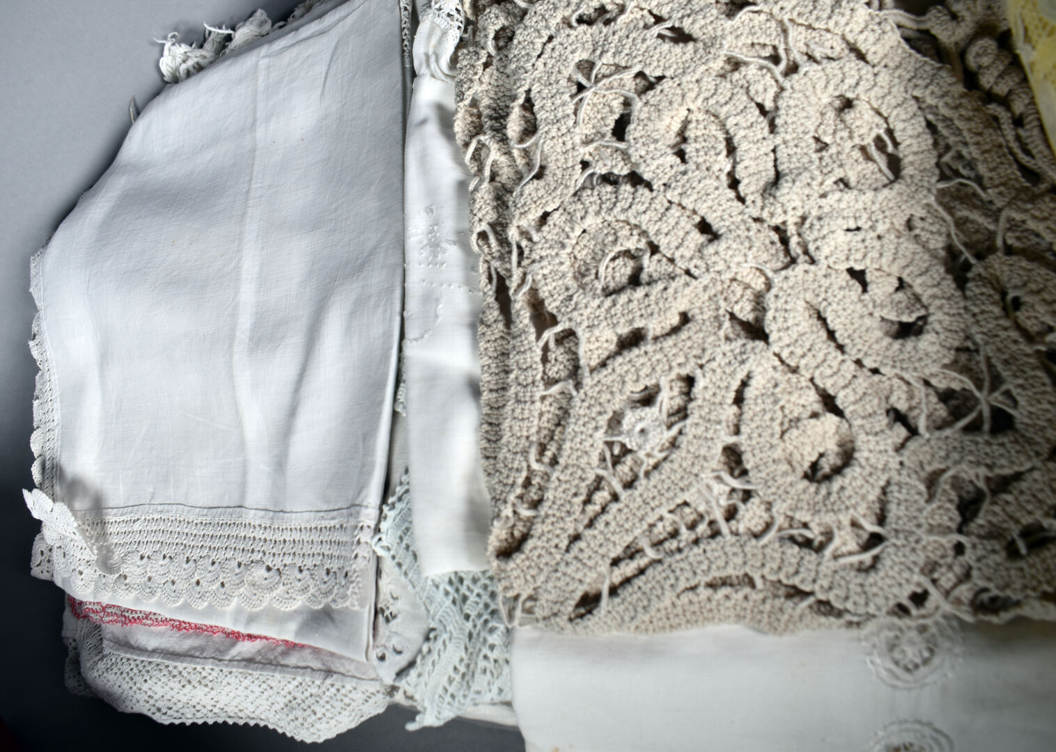 Fort ensemble de linge de maison dont carrés brodés, mouchoirs et carrés, napperons brodés, centres de tables et divers (quelques piqures).