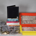 Fort ensemble de pièces présentées en vrac et en pastilles de collection. Pièces France et étranger. On joint 9 ouvrages sur la numismatie et des classeurs de collection de pièces (1 vide).
