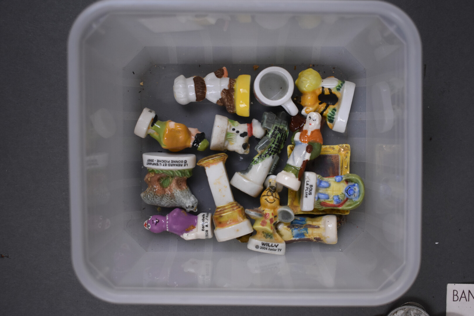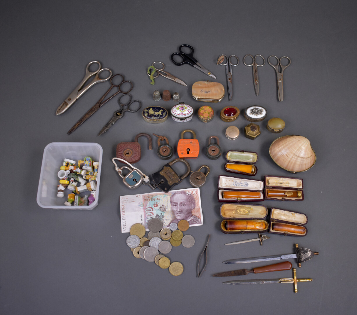 Fort ensemble d’objets de vitrine soit une tabatière en coquillage, un petit porte monnaie à monture de nacre et cinq porte cigarettes en ambre, un à monture en or 18K 750/1000e (accidenté). Poids brut : 4,43 g. Ciseaux, cadenas, petit lot de fèves, coupe papier, petits pilluliers et divers.