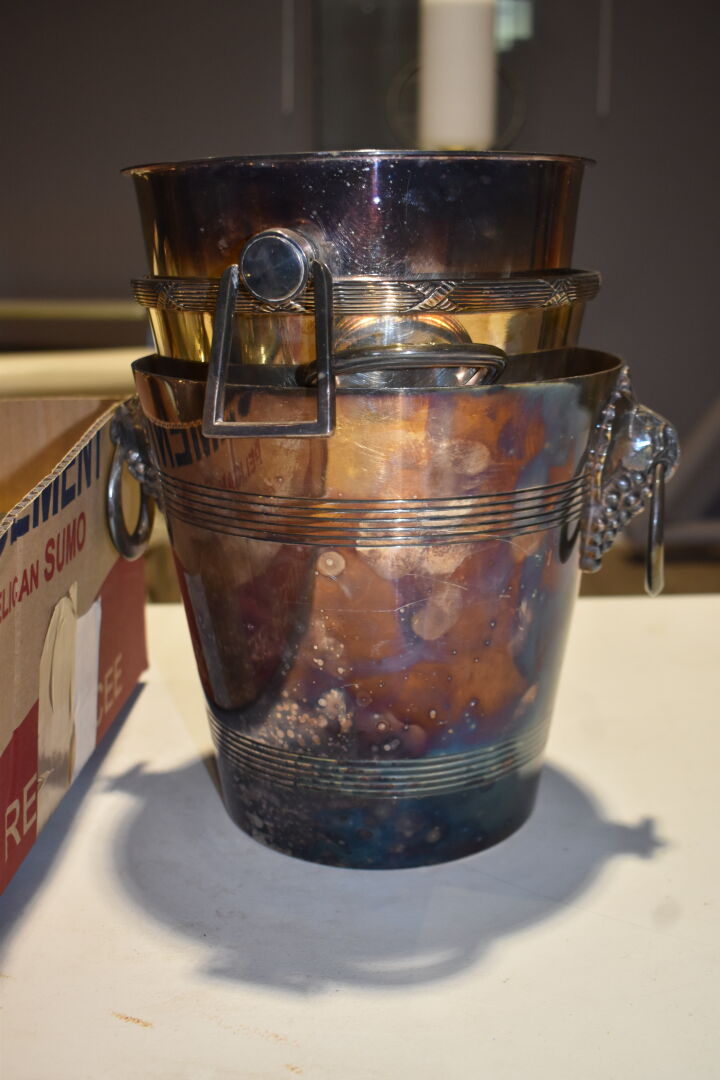 Fort ensemble en métal argenté dont partie de service à thé, plateaux, légumiers, saupoudreuse, verseuse, seaux à champagne et divers (3 cartons).