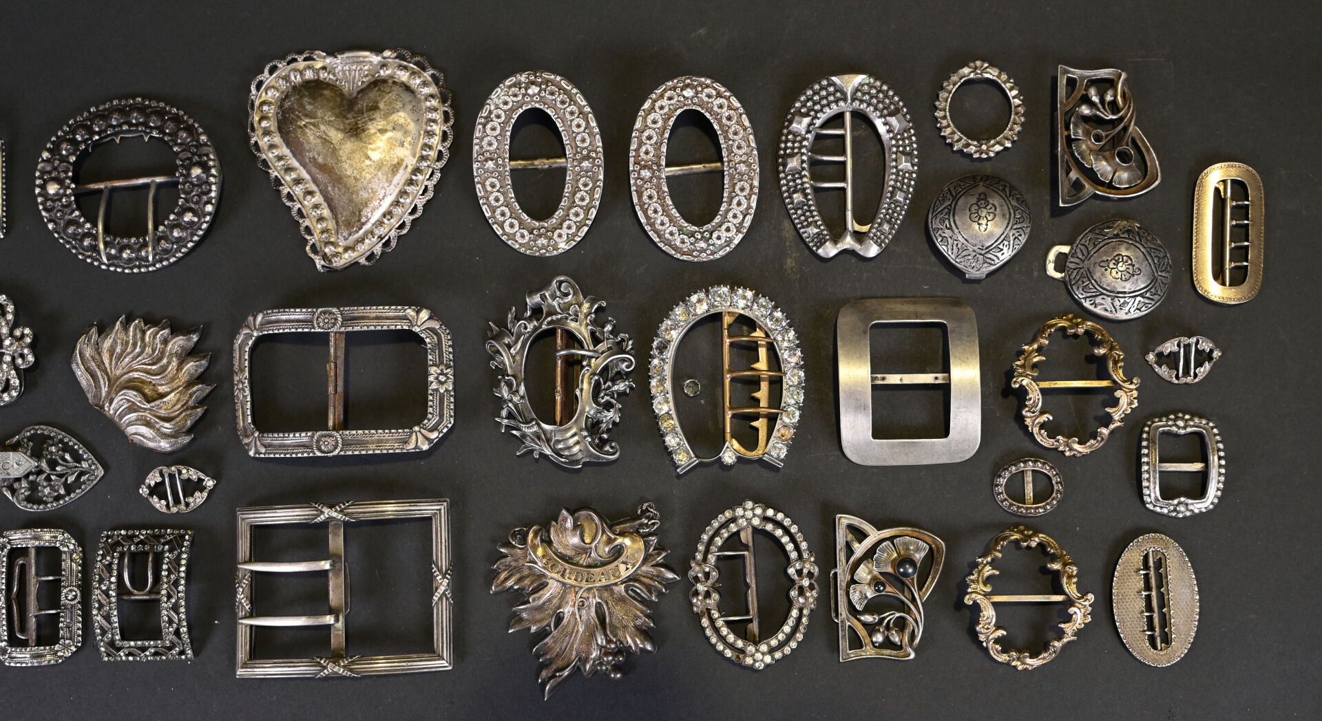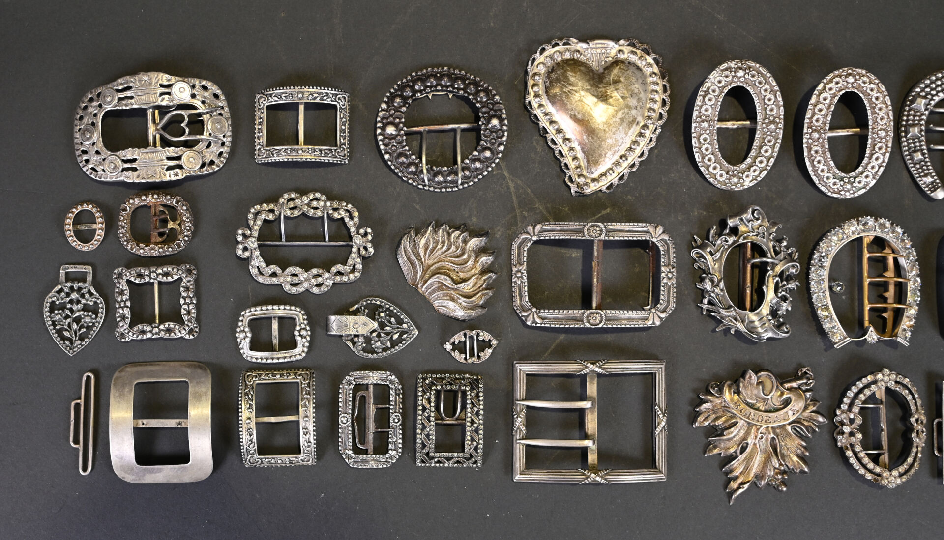 Fort lot de boucles de ceinture en argent 925 et 800/1000e, quelques unes avec verroterie, pierres ou strass, des manques. Poids brut total. : 633 g.