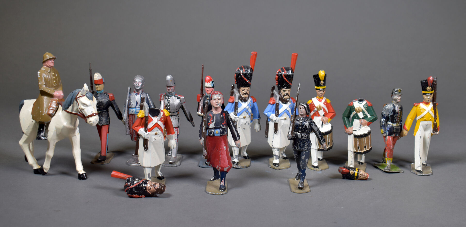 Fort lot de figurines type CBG Minialu de grandes tailles, stylisées, fabrication à partir de la fin des années 30 en plomb creux et aluminium dont Zouaves, garde napoléonienne, cavalier français, armée française des années 30 etc.
