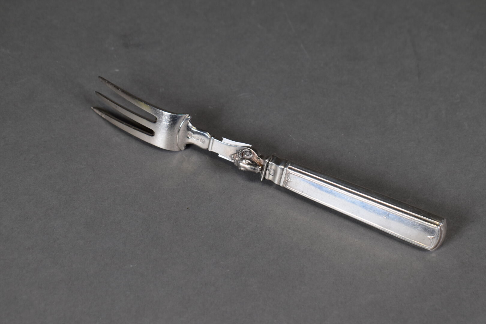 Fourchette de service à viande, le manche en argent fourré et la fourche en argent poinçon vieillard 1er titre 925/1000e. Le dos orné d’une tête de bélier (un manque). Poids brut. : 199 g.