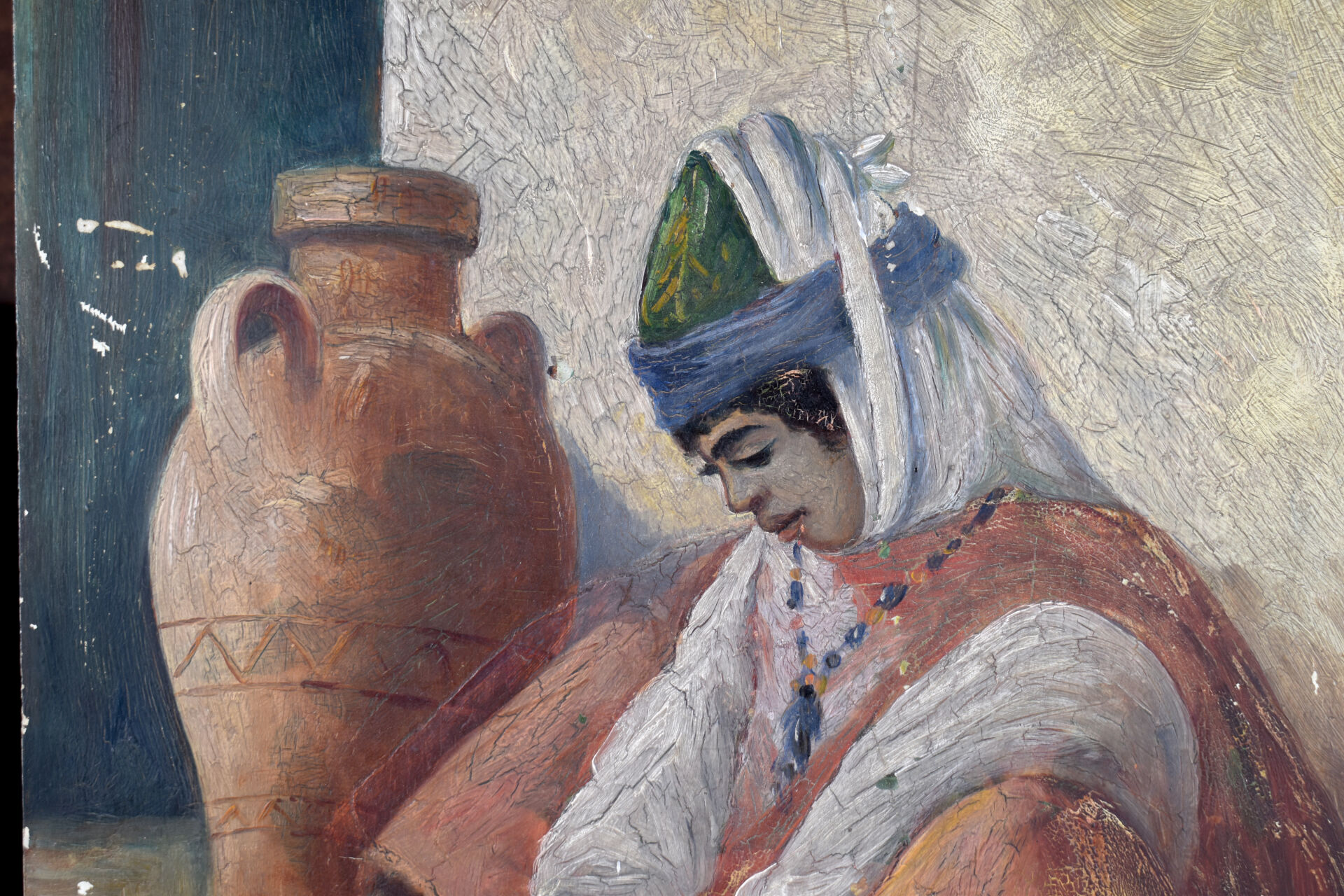FOURNAL (Ecole orientale). Femme à l’ouvrage. Huile sur panneau signée en bas à droite. 33 x 24 cm.