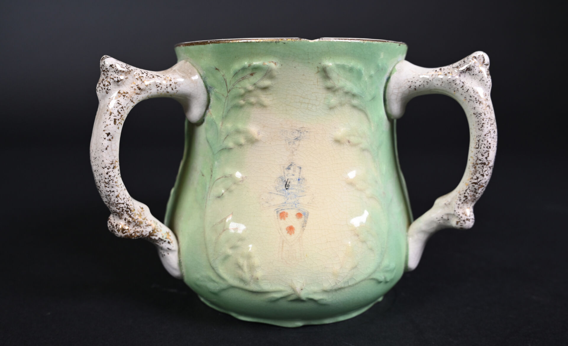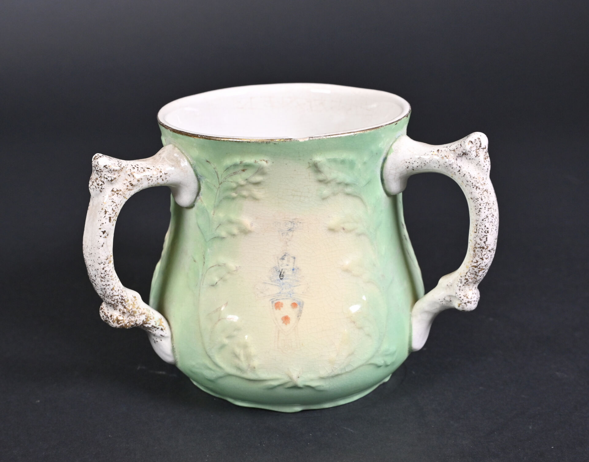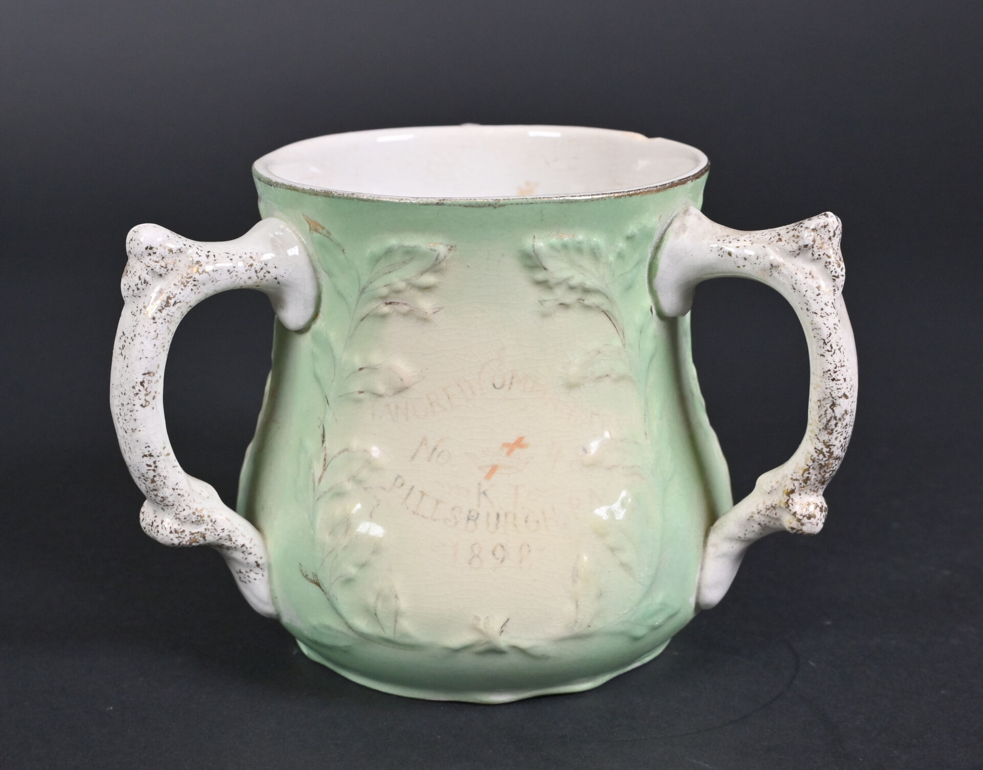 FRANC MACONNERIE. Coupe de l’amitié en porcelaine émaillée vert, bleu, rouge et or (usures, éclat au col) réalisée pour la loge « Wellington Tancred Commandery No 48 – Pitsburg. Manufacture American China Co. de Toronto. 1898. Haut. : 11 cm.
