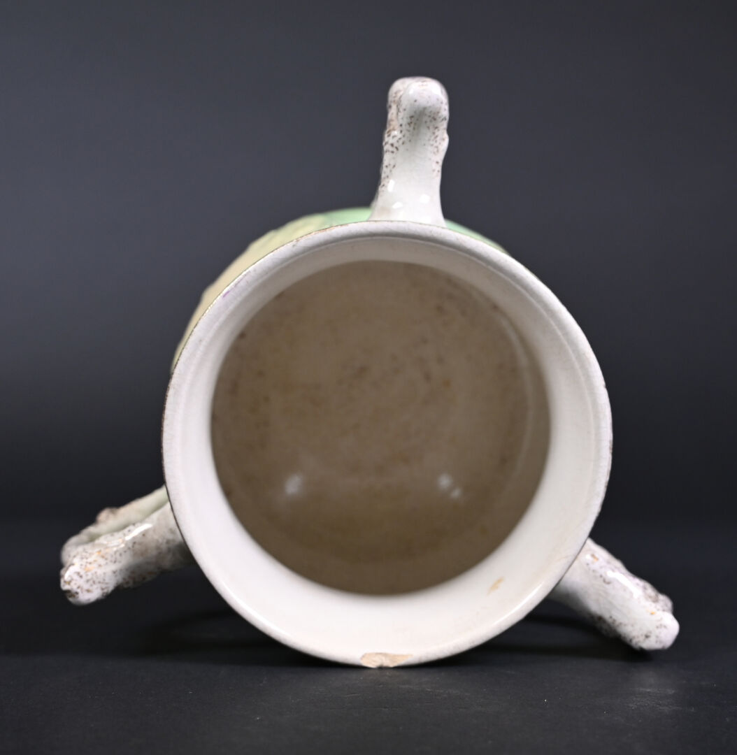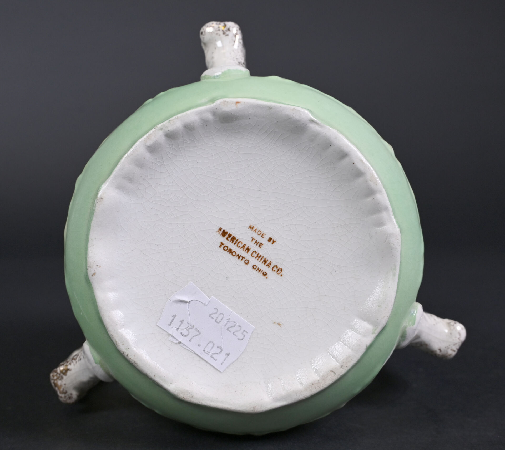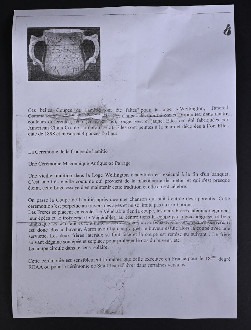 FRANC MACONNERIE. Coupe de l’amitié en porcelaine émaillée vert, bleu, rouge et or (usures, éclat au col) réalisée pour la loge « Wellington Tancred Commandery No 48 – Pitsburg. Manufacture American China Co. de Toronto. 1898. Haut. : 11 cm.