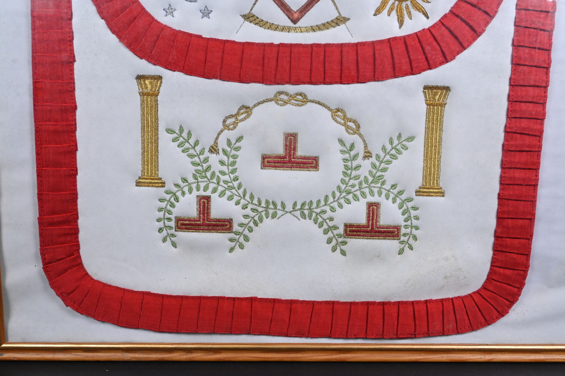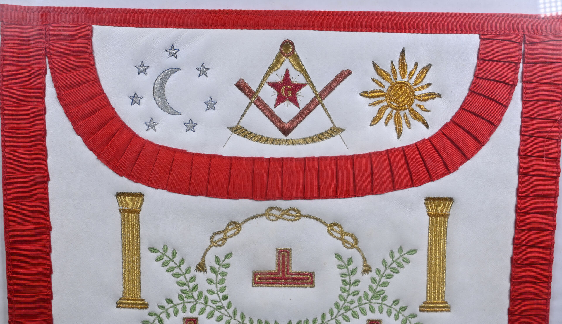 FRANC MACONNERIE Tablier de vénérable maitre en soie brodée et bordé de galon rouge (taches). Sous cadre.