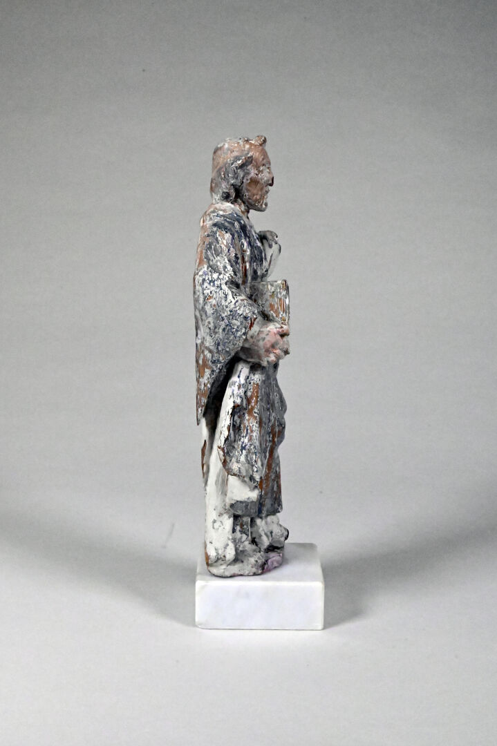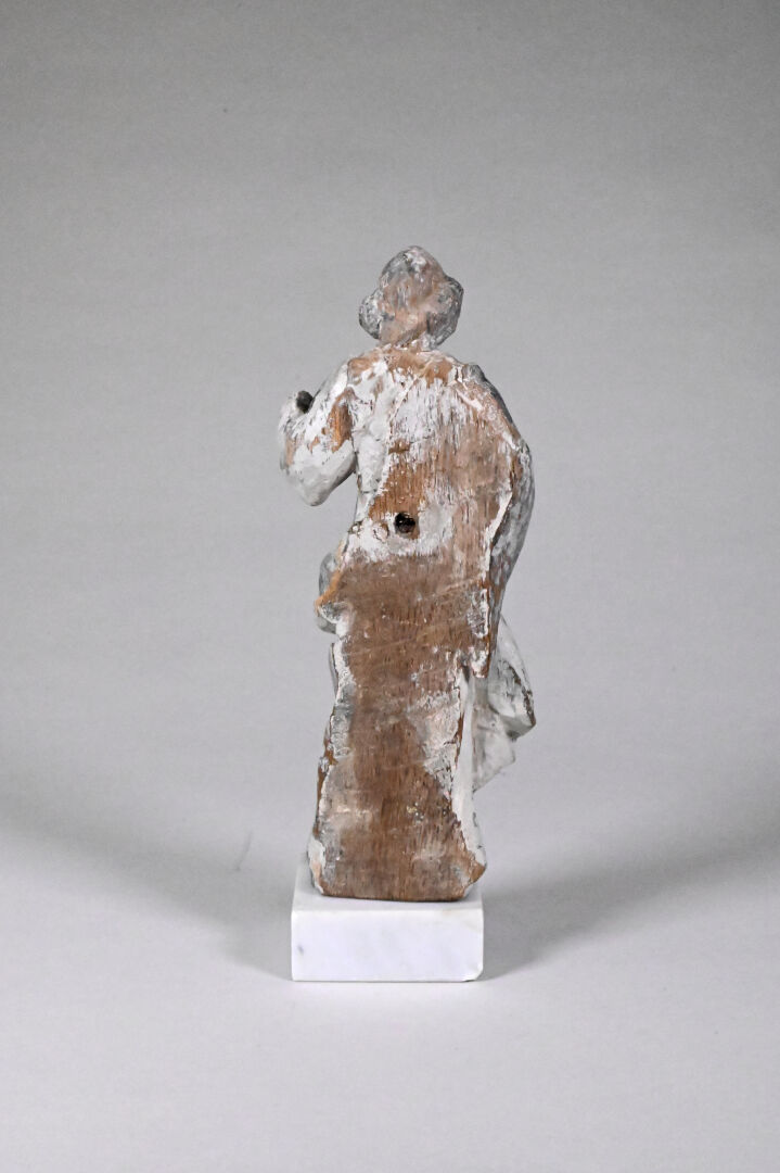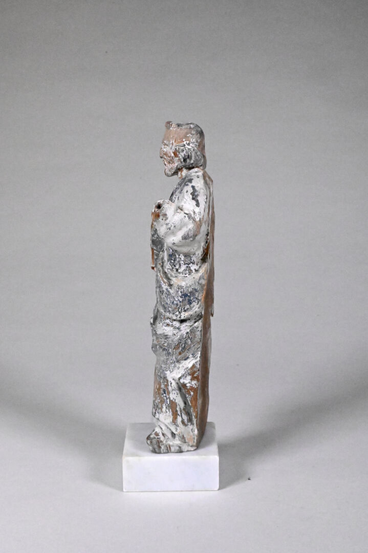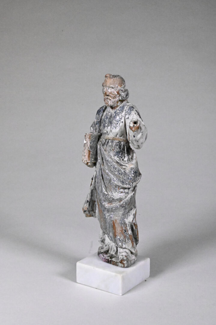 France, XVIIème siècle. Saint apôtre. Statuette en bois polychromé. H. : 29 cm, sur un socle en marbre blanc.
