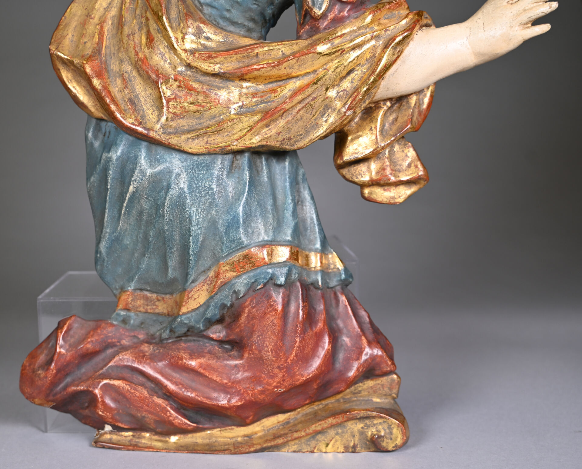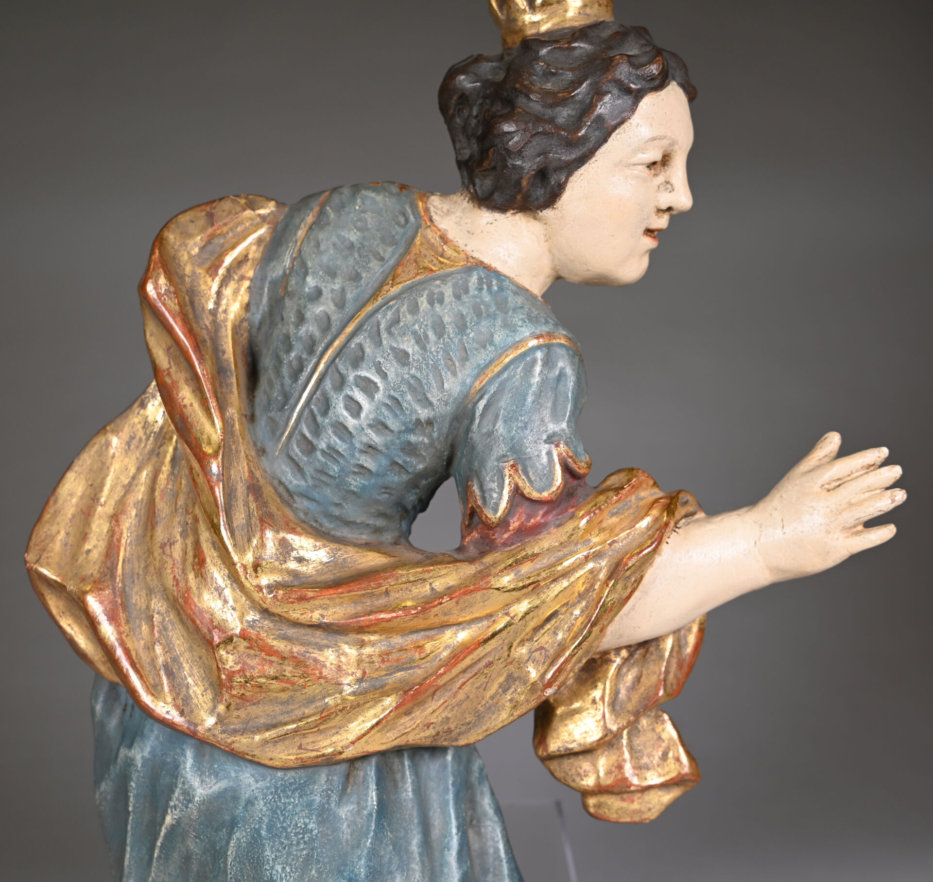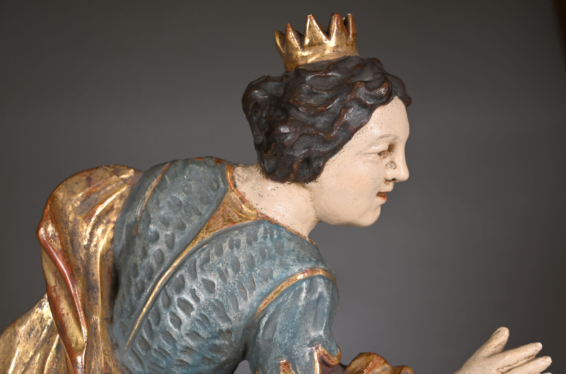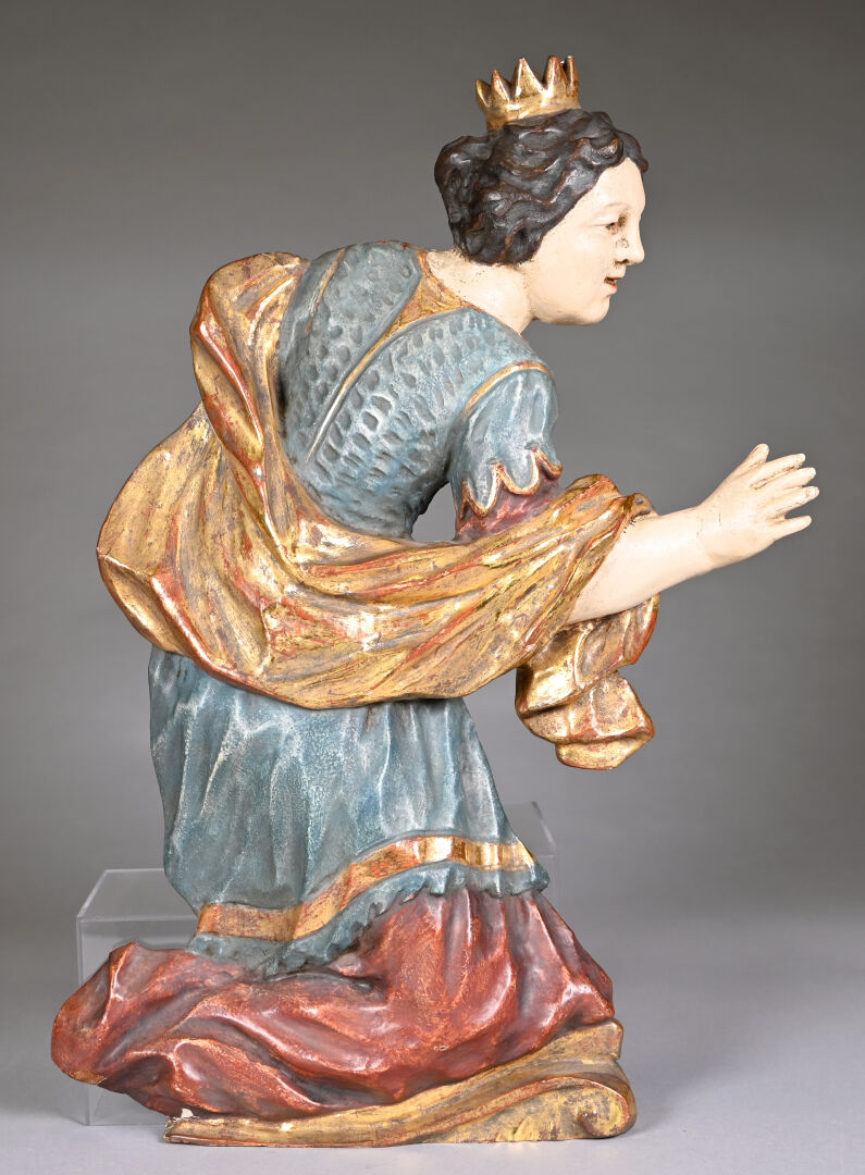 France, XVIIème siècle Sainte femme couronnée et agenouillée Figure d’applique sculptée en relief en bois polychromé et doré (Petites usures à la polychromie) Haut. : 52 cm.