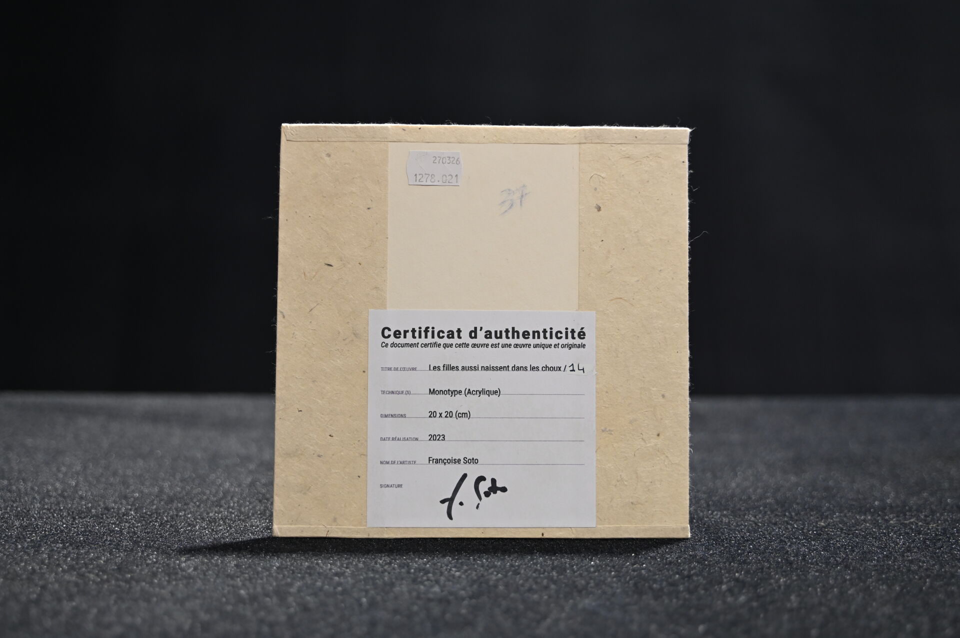 Françoise SOTO (XXe siècle). « Les filles naissent aussi dans les choux ». Monotype sur papier, avec certificat au dos daté de 2023. 20 x 20 cm.