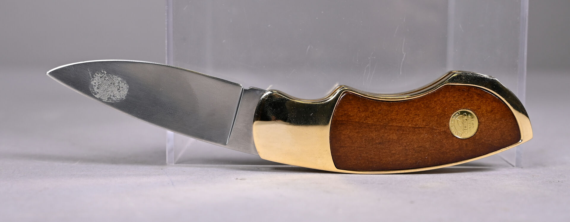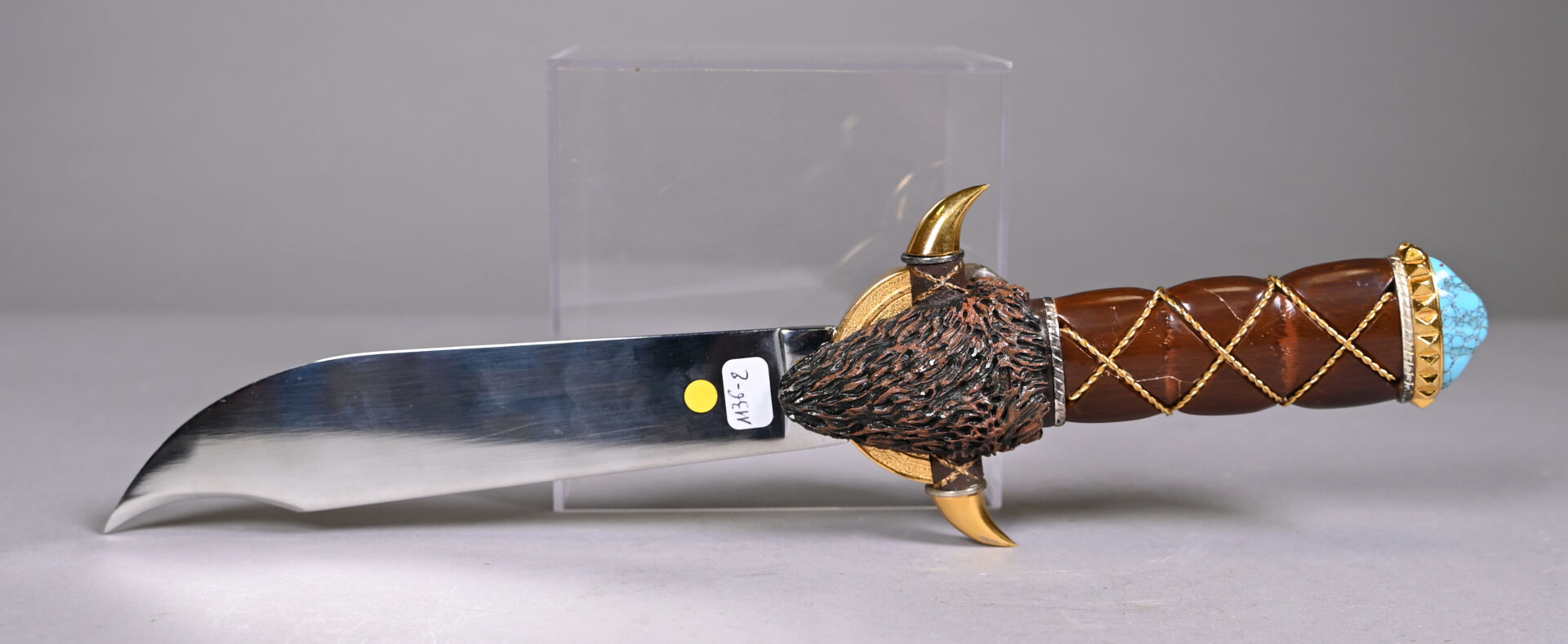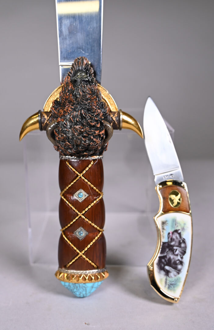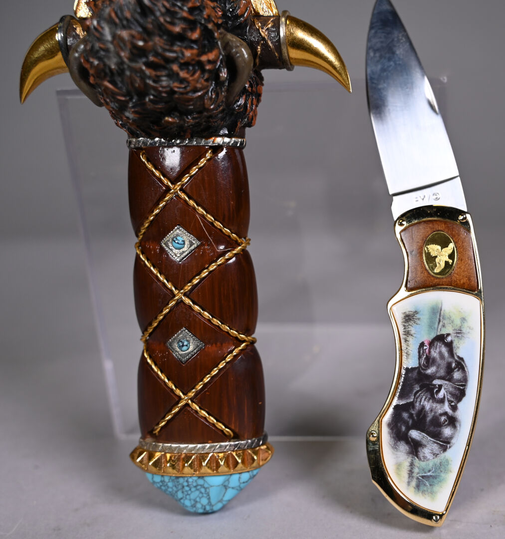 FRANKLIN MINT. Deux couteaux dont un pliant, l’autre à décor d’une tête de bison. Long. : 35 cm. Le petit avec étui.