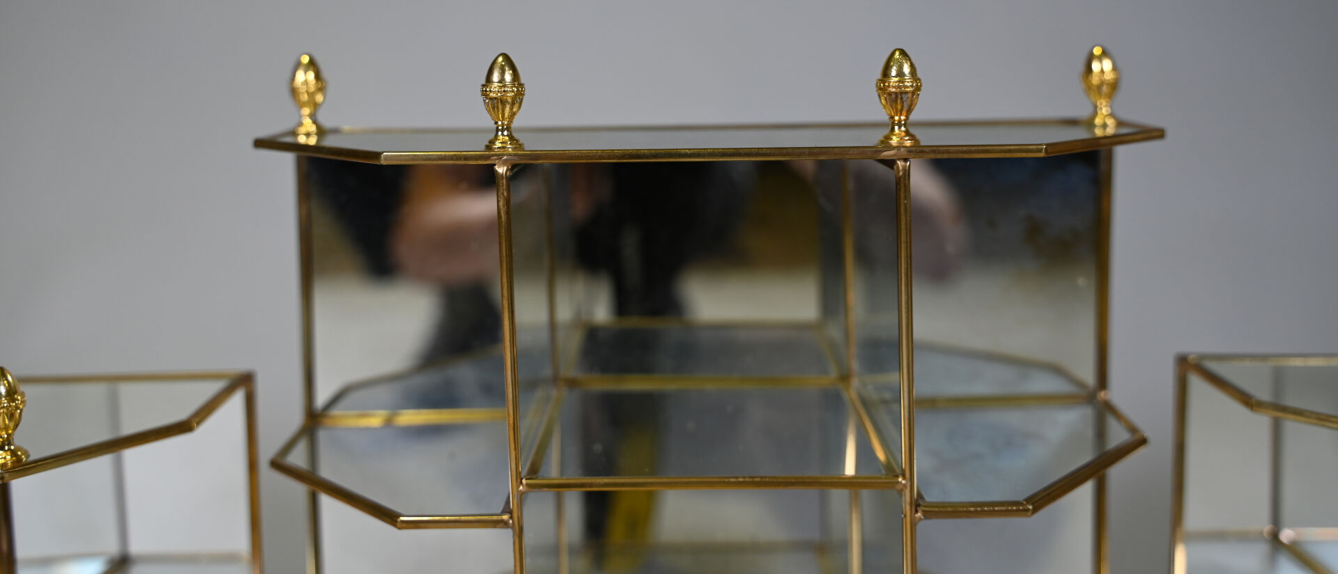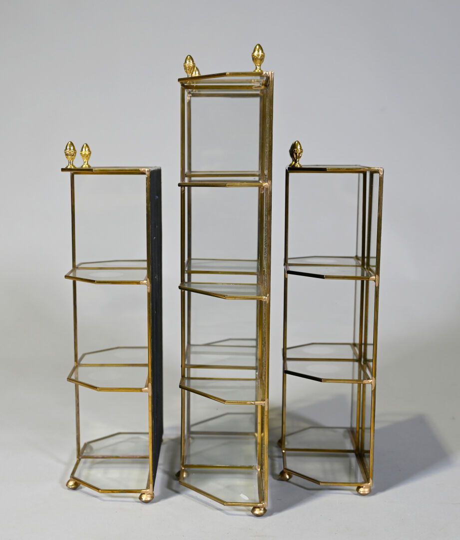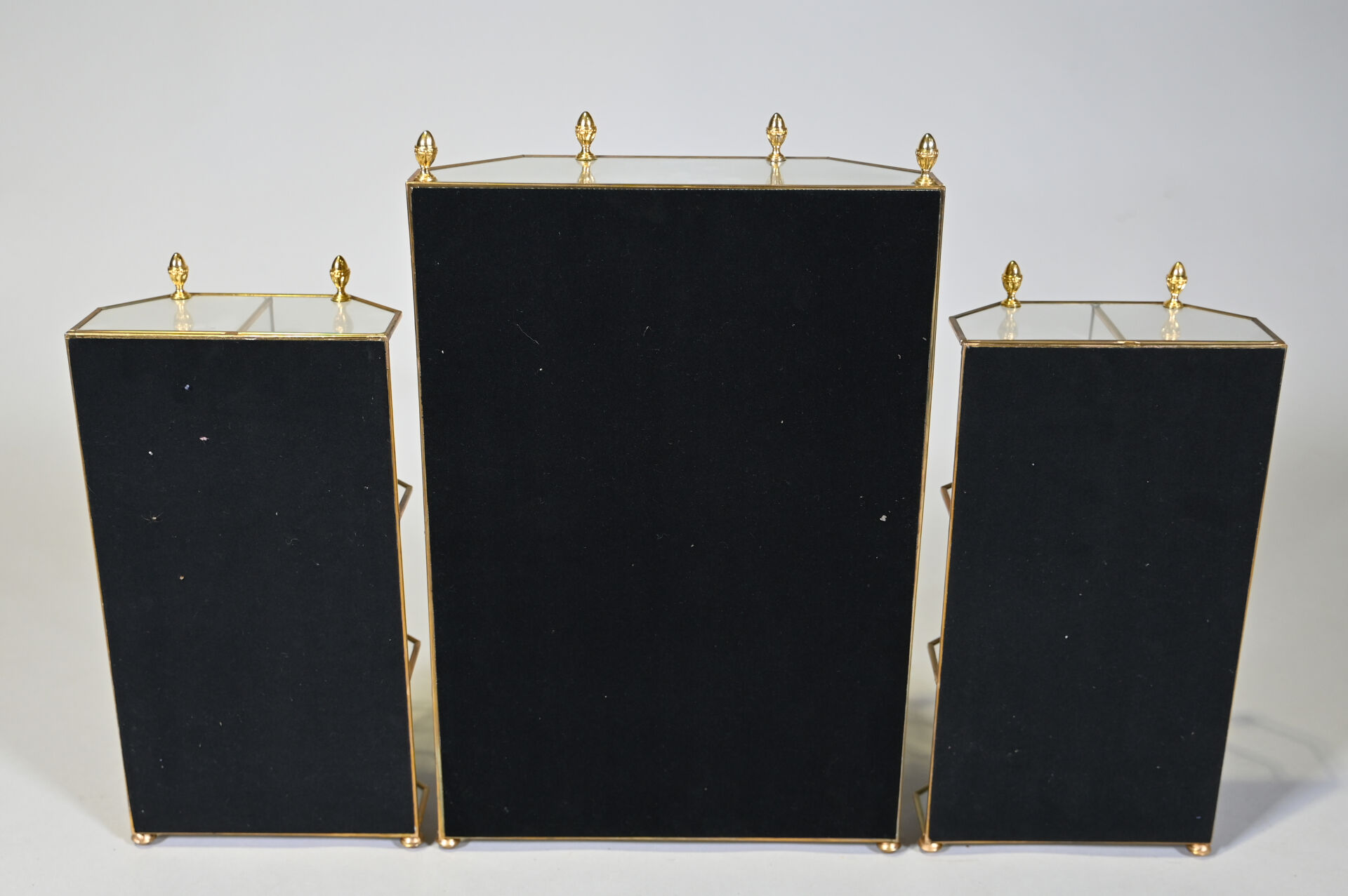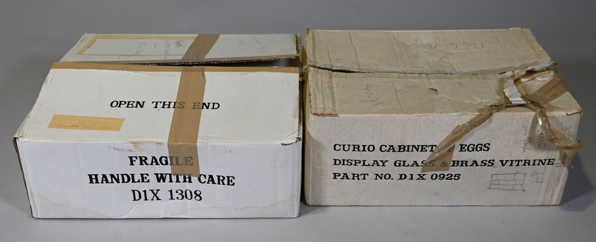 FRANKLIN MINT. Suite de 3 vitrines en métal dans les boites d’origines sur la série « Le Monde Merveilleux des oeufs ». Haut : 42 cm pour la plus grande.