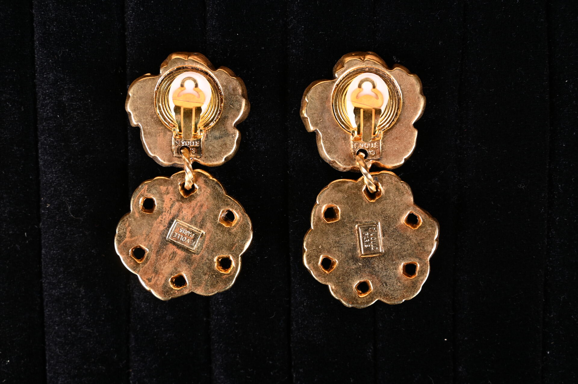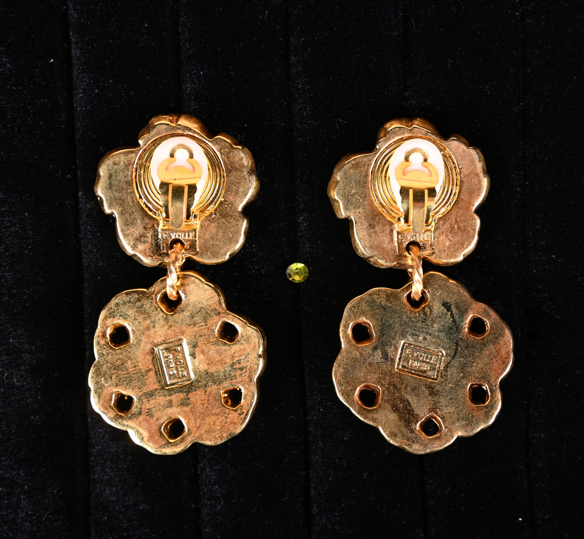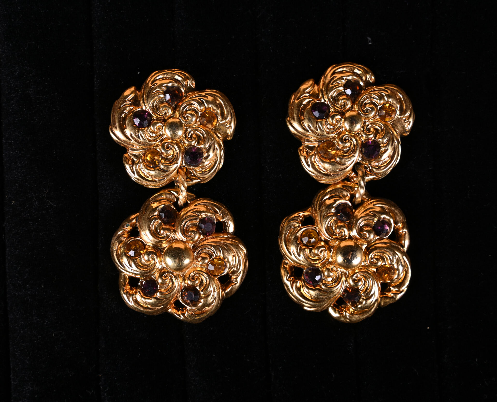 FREDERIC VOLLE – Ensemble « Rosaces » – (années 1990). soit : – Paire de clips d’oreilles dite « trembleuses » en résine moulée métallisée or, chacun serti de 10 cristaux imitations améthystes et topazes. Signée. Haut. : 8,5 cm. – Paire de clips d’oreilles dite « trembleuses » en résine moulée métallisée or, chacun serti de 10 cristaux imitations émeraudes et péridots (manques). Signée. Haut. : 8,5 cm.