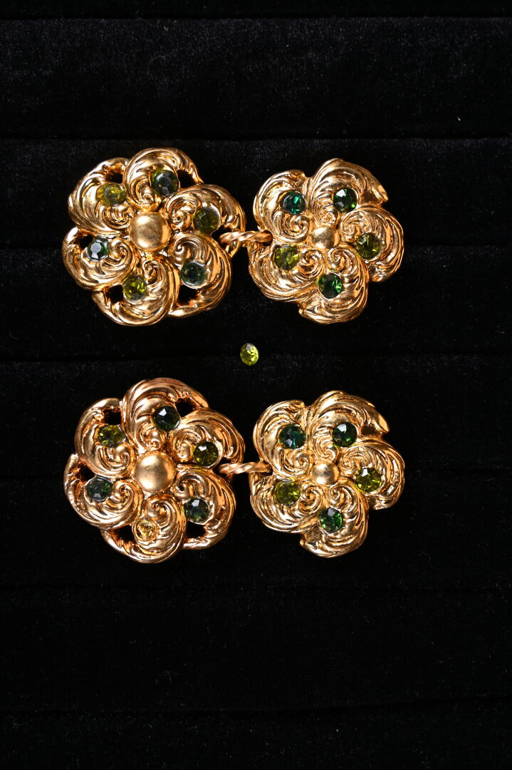 – Paire de clips d’oreilles dite « trembleuses » en résine moulée métallisée or, chacun serti de 10 cristaux imitations émeraudes et péridots (manques). Signée. Haut. : 8,5 cm.