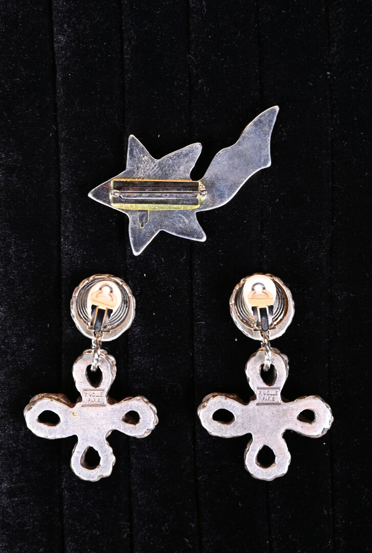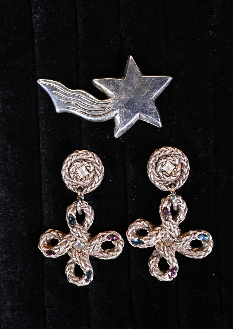 FREDERIC VOLLE – Ensemble soit : – « Comète » – (années 1990). Broche en résine moulée métallisée argent figurant une comète. Non siignée. Haut. : 8 cm. « Cordages » – (années 1990). Paire de clips d’oreilles dite « trembleuses » en résine moulée métallisée argent, figurant des cordages noués, chacun serti de cristaux imitations diamants, saphirs et tourmalines. Signée. Dim. : 4,5 x 4,5 cm.