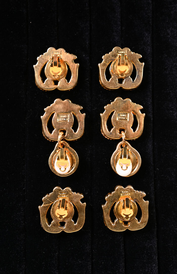 FREDERIC VOLLE – « Fontainebleau » – (années 1990). Ensemble soit : – Paire de clips d’oreilles en résine moulée métallisée or, chacun serti d’un cristal imitation améthyste. Signée. Diam. : 4,5 cm. – Paire de clips d’oreilles en résine moulée métallisée or, chacun serti d’un cristal imitation améthyste. Signée. Diam. : 4 cm. – Paire de clips d’oreilles dite « trembleuses » en résine moulée métallisée or, chacun serti de deux cristaux imitation diamants. Signée. Haut. : 7 cm.