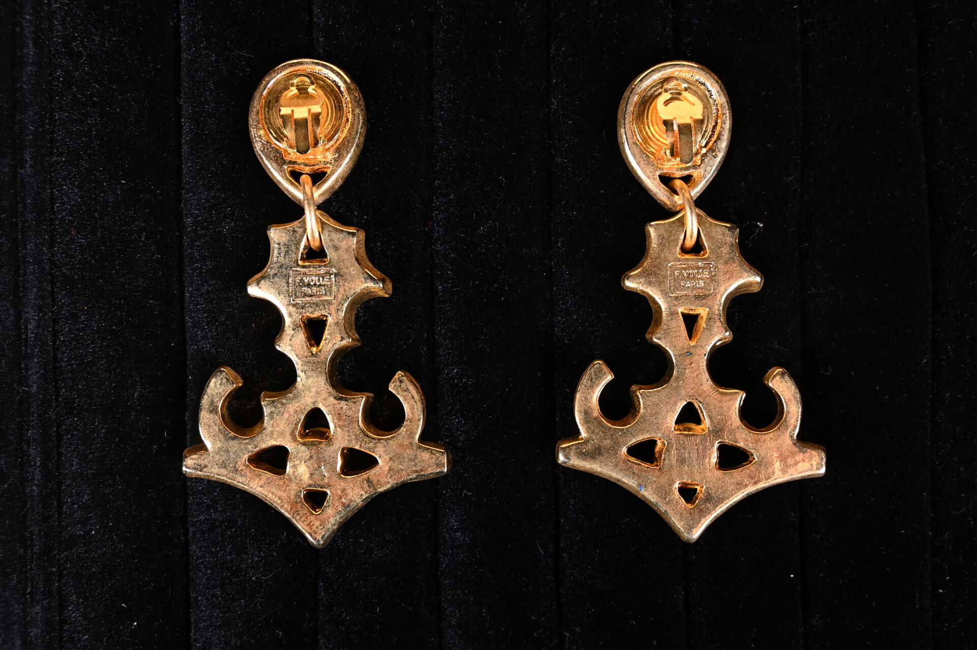 FREDERIC VOLLE – « Marrakech »- (années 1990). Paire de clips d’oreilles dite « trembleuses » en résine moulée métallisée or rehaussée de laque et agrémentée de trois cabochons en résine imitation lapis-lazuli (un manque à l’émail). Signée. Haut. : 11 cm.