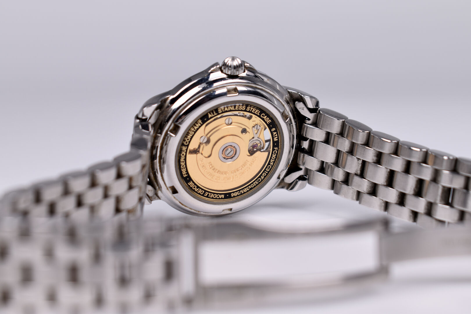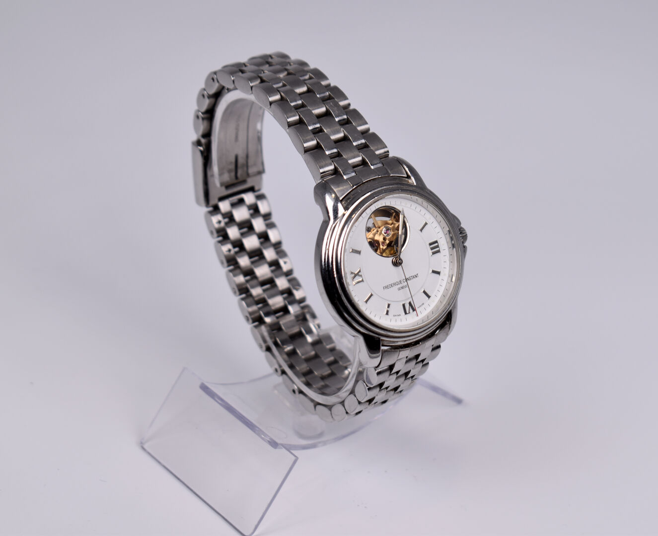 Frederick CONSTANT. Montre bracelet d’homme en acier. Cadran signé à balancier apparent. Mouvement mécanique à remontage automatique (verre rayé).