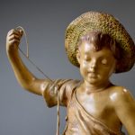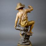 Friedrich GOLDSCHEIDER (1845-1897). Le pêcheur et sa prise. Figure en céramique émaillée (un manque à la queue du poisson). Marqué au dos avec mention « reproduction réservée ». Haut : 45 cm. Socle garni de velours vert.