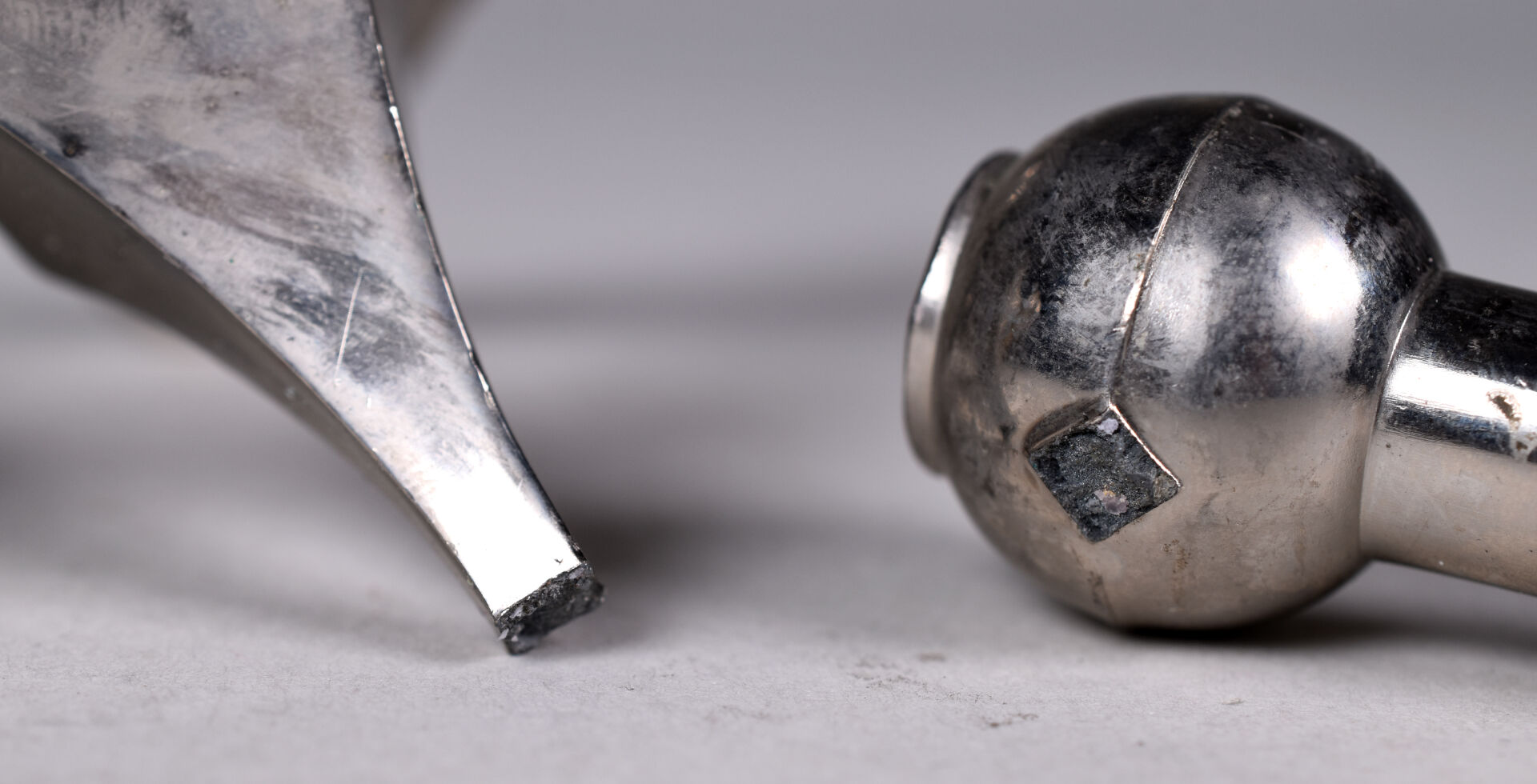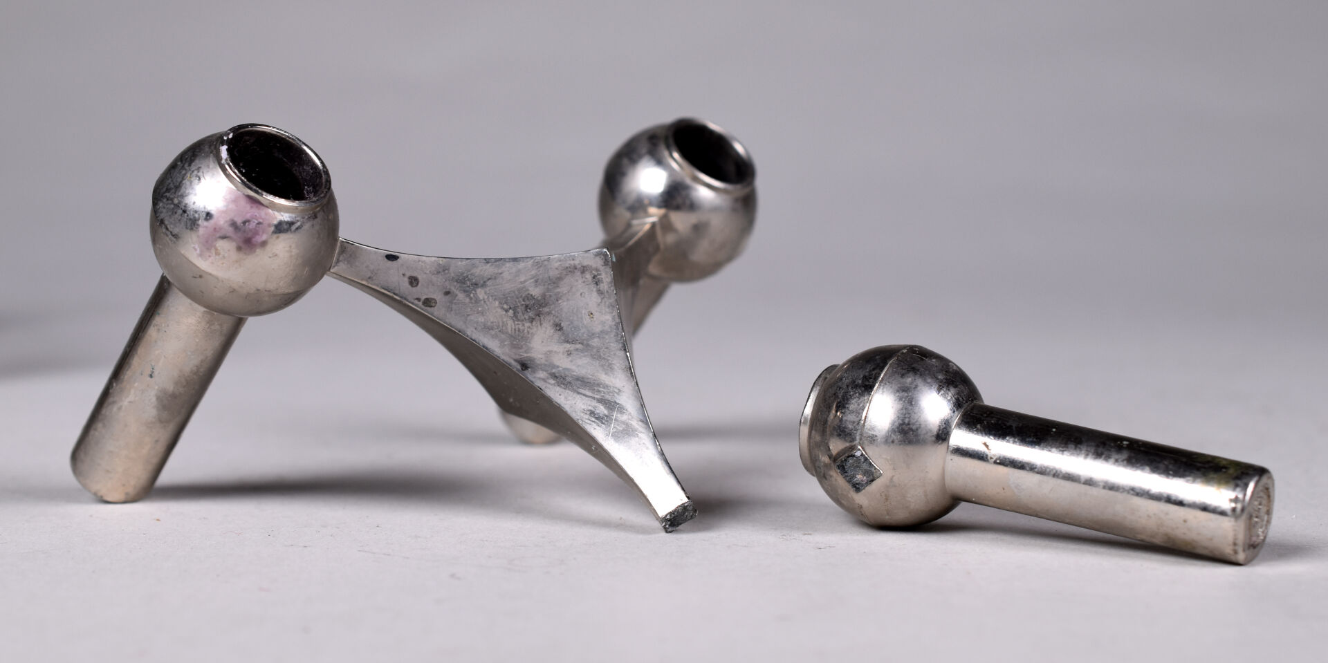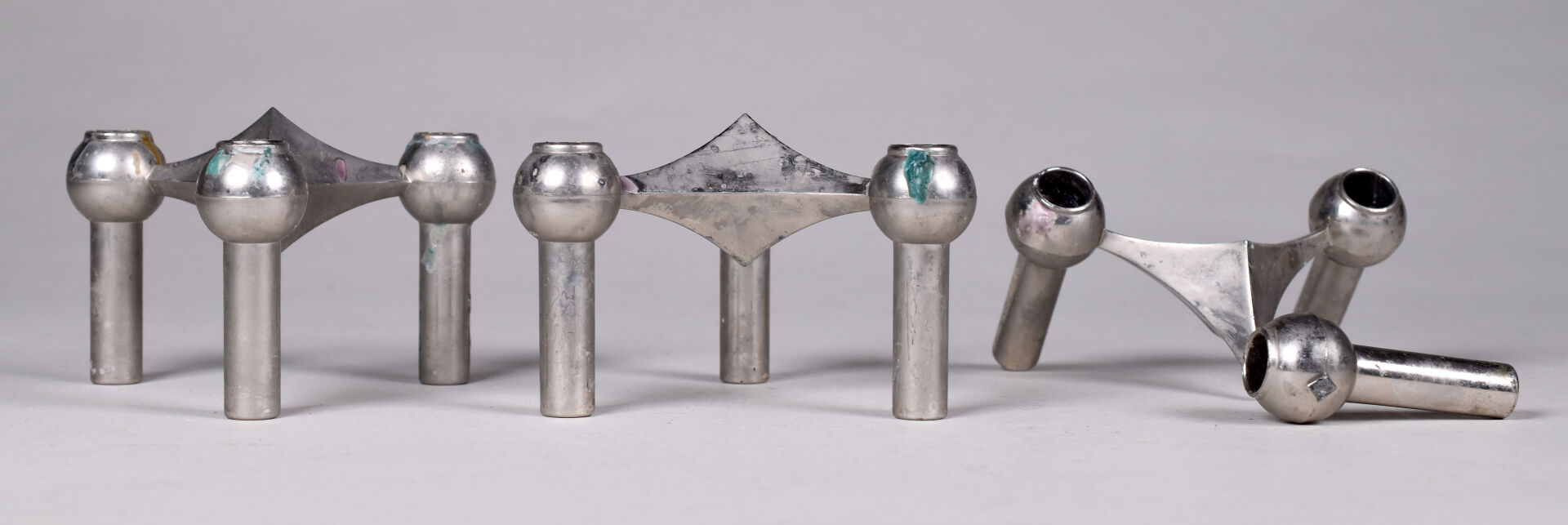 Fritz NAGEL (XXème). Trois candélabres de table (un accidenté) en métal chromé. Haut. : 7 cm.