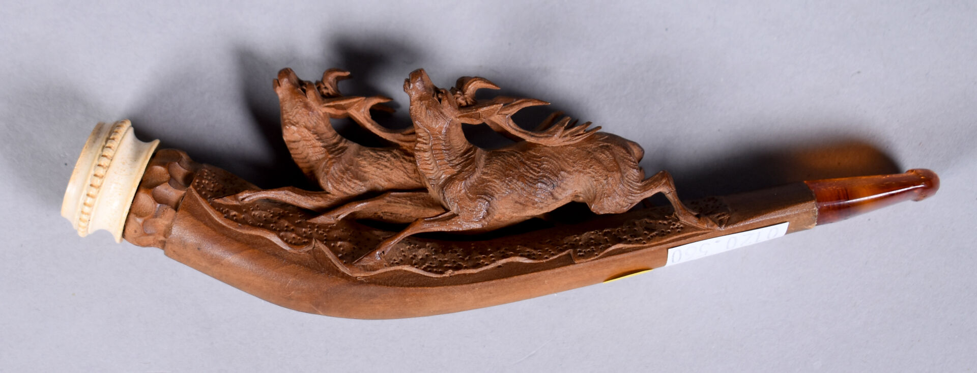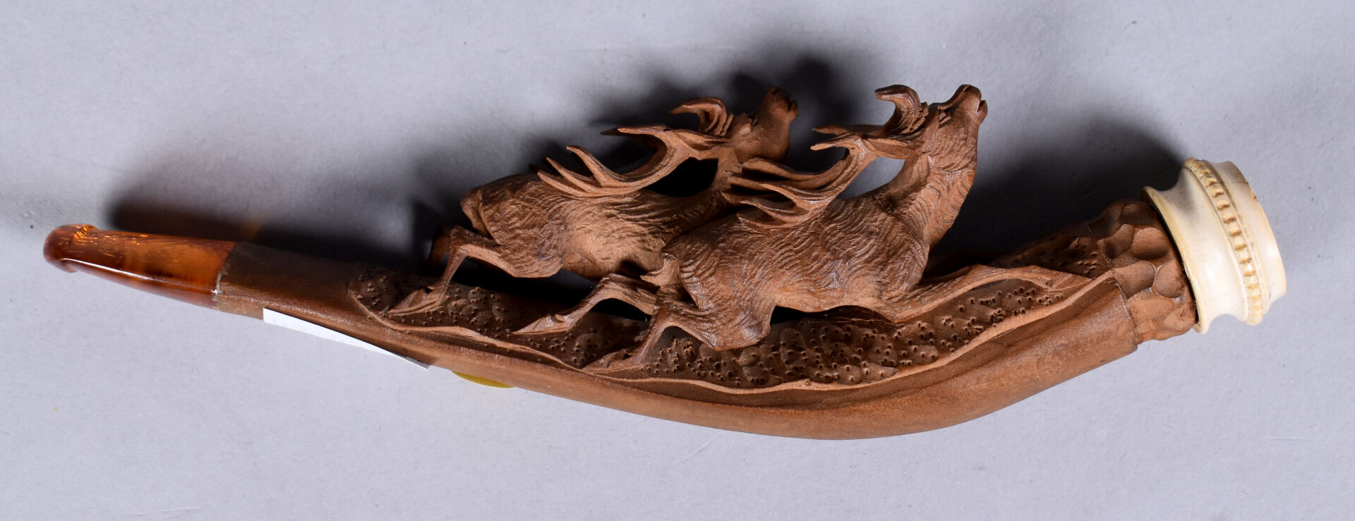 Fume-cigarette en bakélite, noyer sculpté de deux cerfs et écume de mer. XXe siècle. Long. : 14 cm.