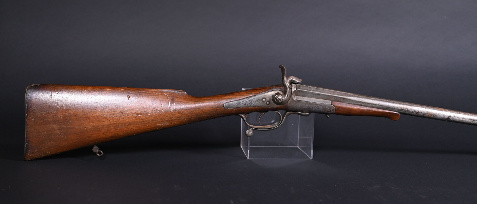 Fusil basculant monocoup à broche et platine à droite. Ouverture par clé Beringer, crosse anglaise. Mécanisme fonctionnel. ARme de Cat. D Etat 1-.