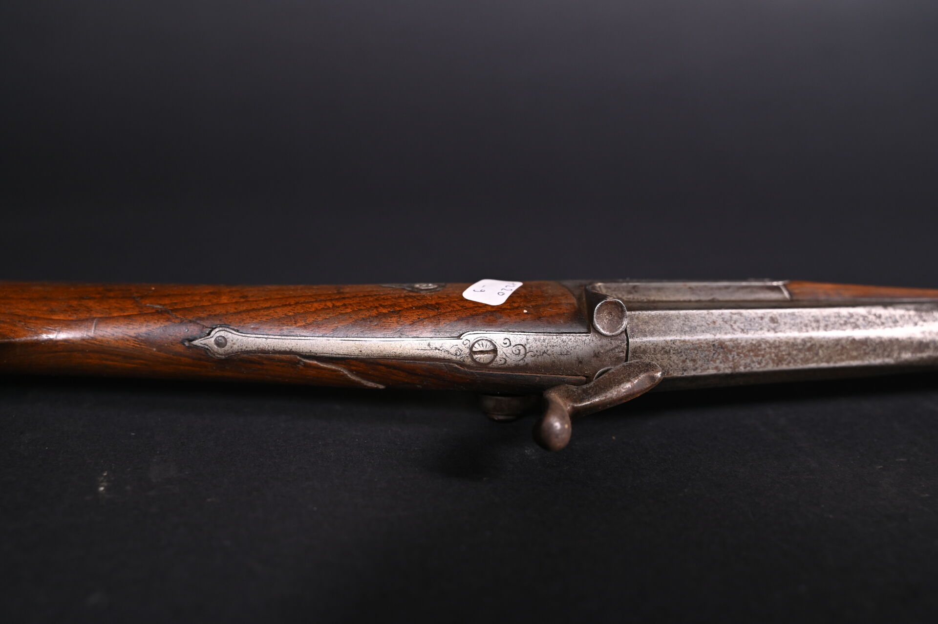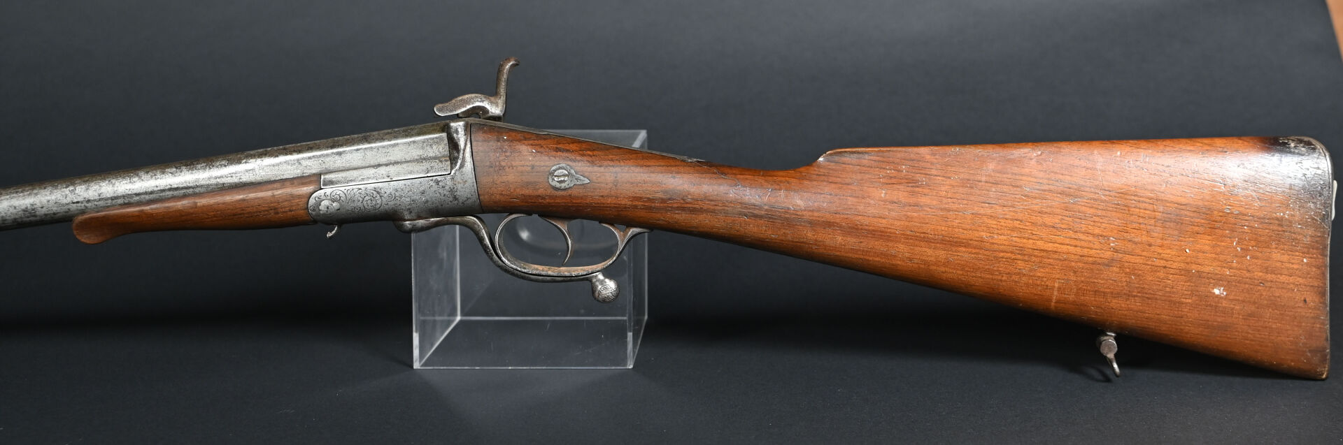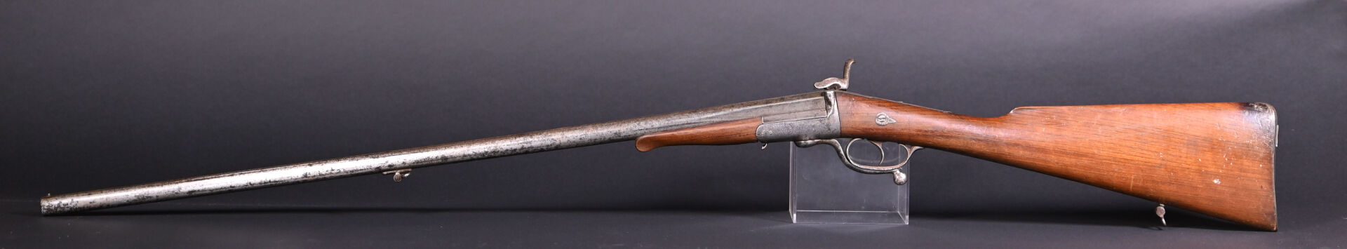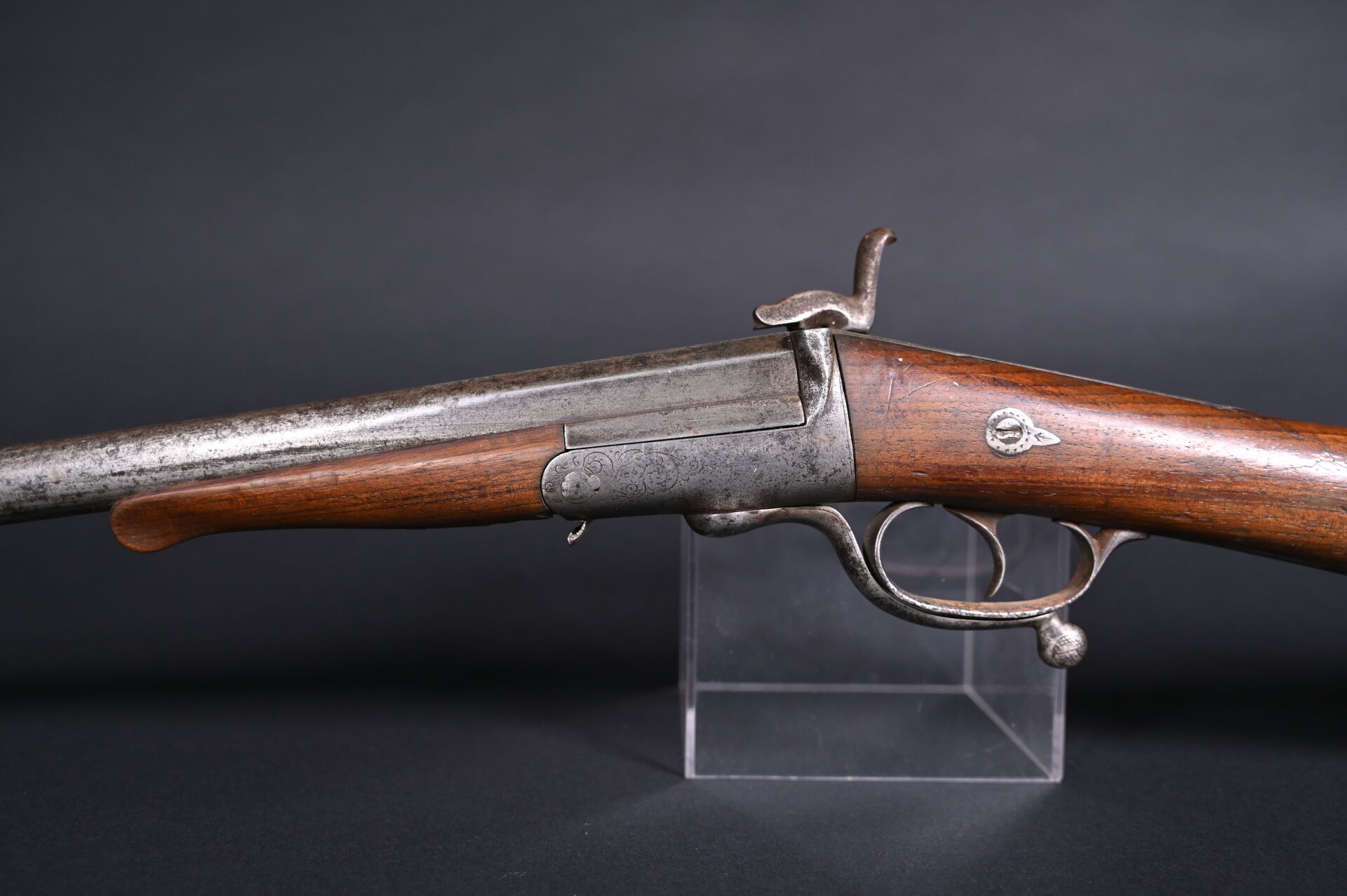 Fusil basculant monocoup à broche et platine à droite. Ouverture par clé Beringer, crosse anglaise. Mécanisme fonctionnel. ARme de Cat. D Etat 1-.