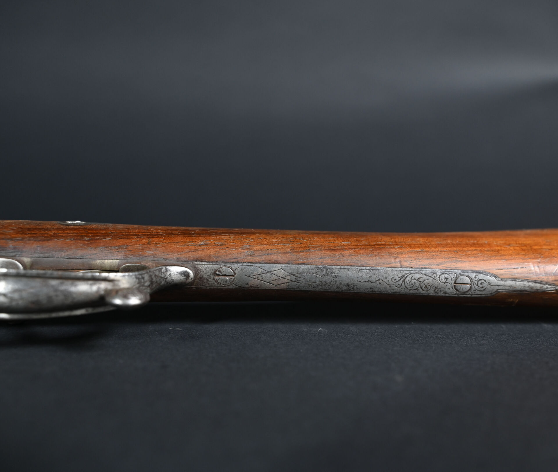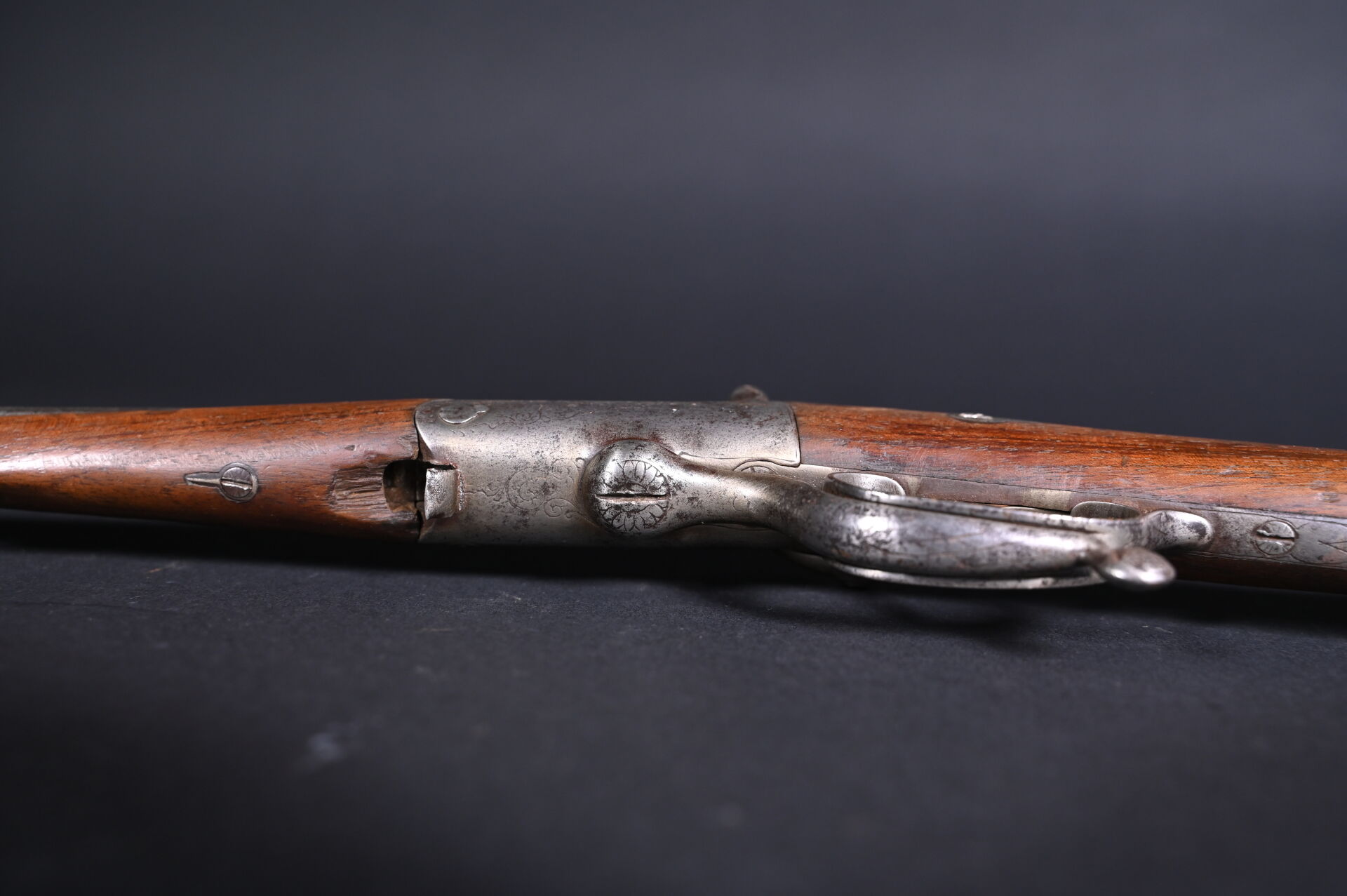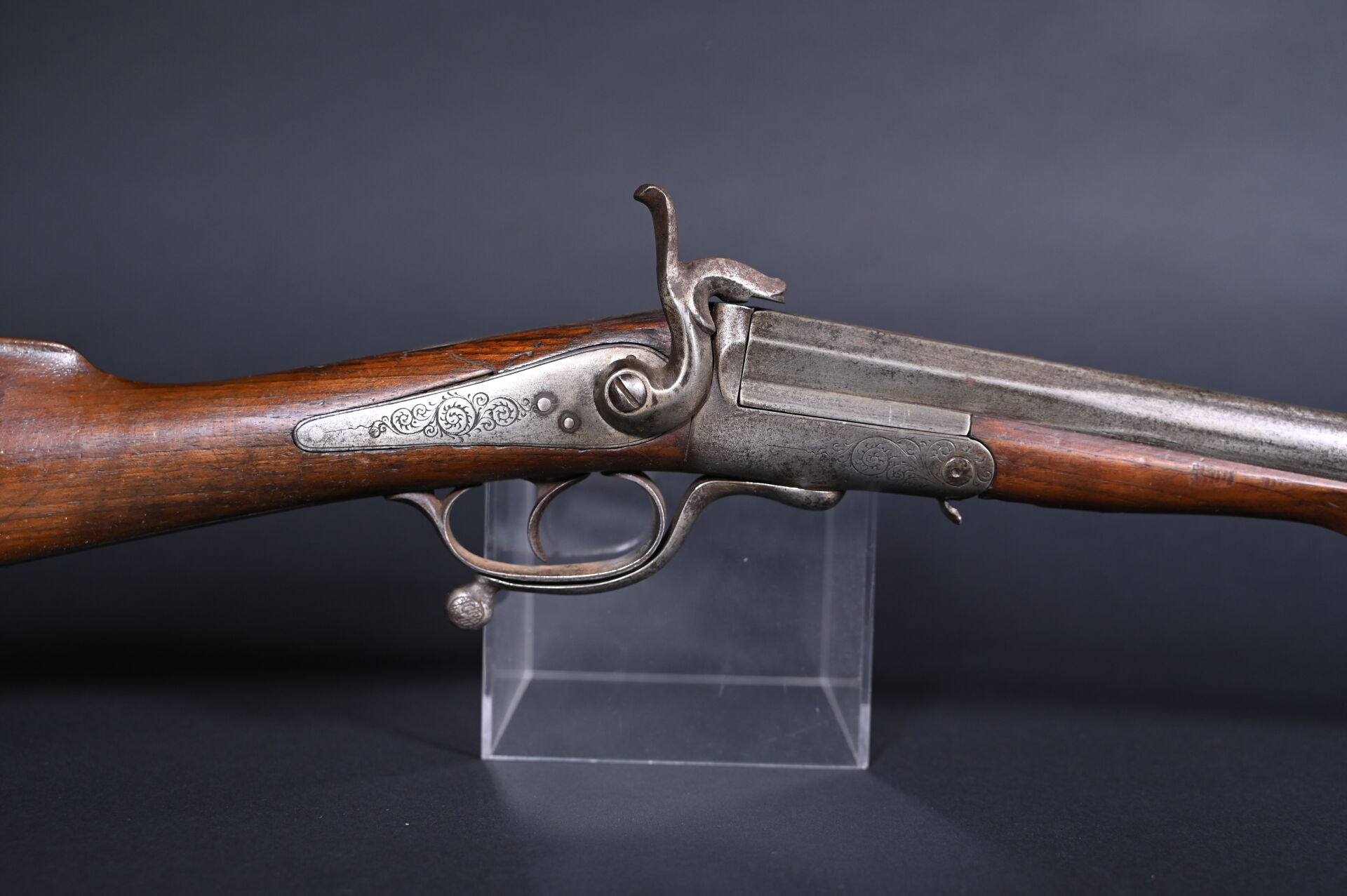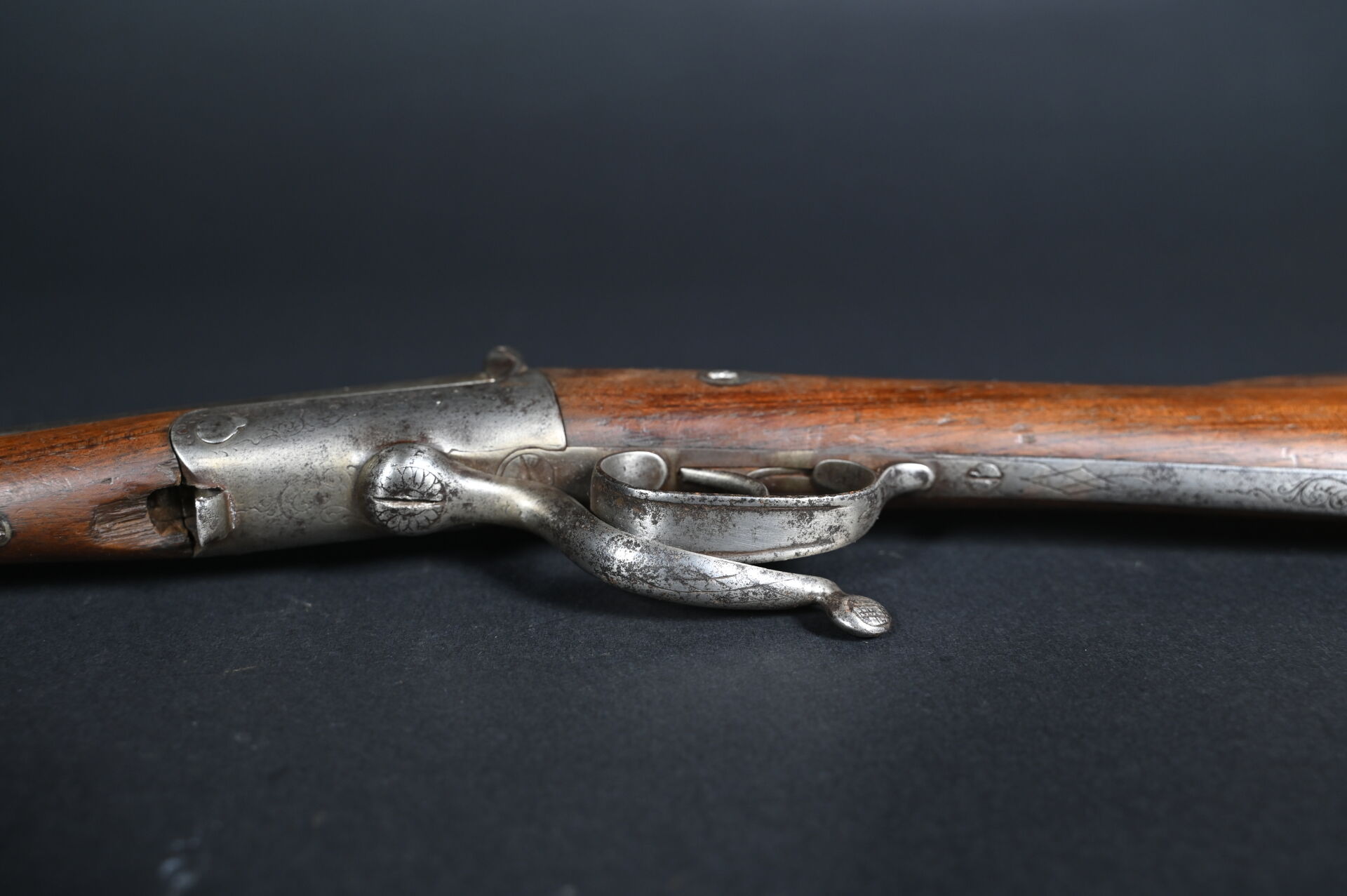 Fusil basculant monocoup à broche et platine à droite. Ouverture par clé Beringer, crosse anglaise. Mécanisme fonctionnel. ARme de Cat. D Etat 1-.