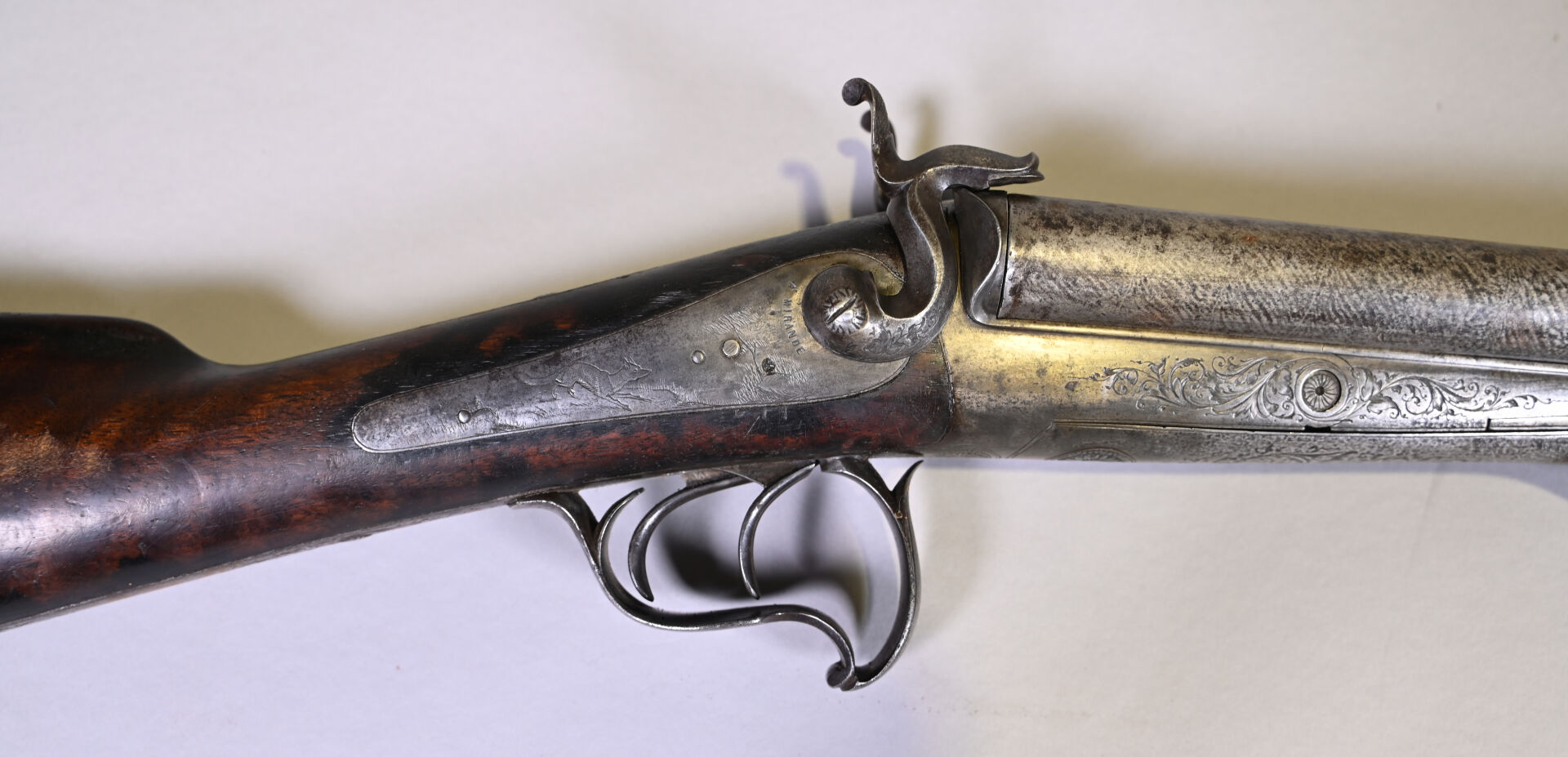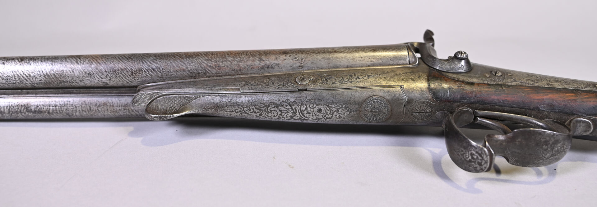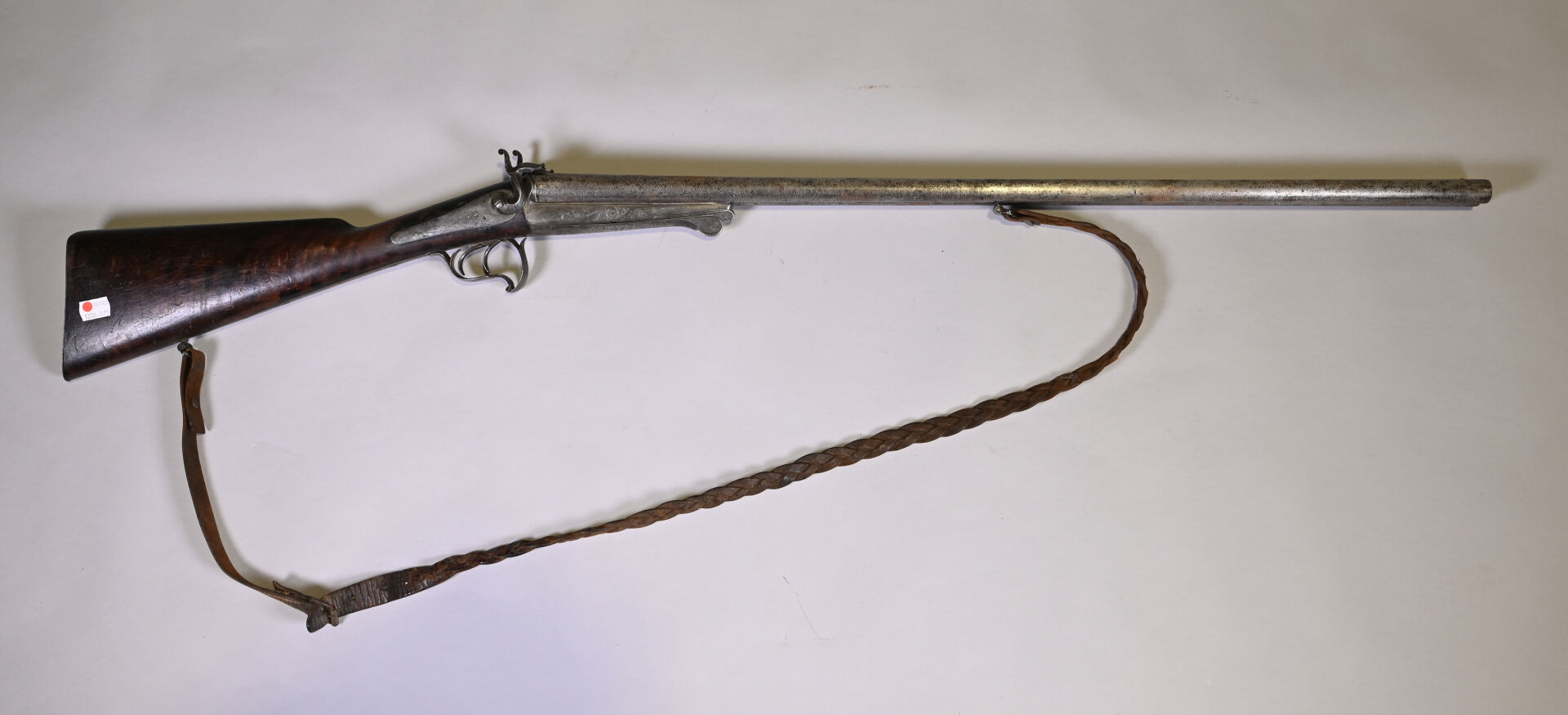 Fusil juxtaposé à broche, système Le Faucheux, calibre 16 par Lacouture à Mirande. Canon en damas, intérieur très propre, un enfoncement sur le canon gauche (facilement restaurable). Gravure de scènes de chasses sur les platines, et de volutes sur la garnie. Pontet à volutes. Crosse anglaise en noyer lisse. Mécanisme fonctionnel. Arme de catégorie D. Long. : 118 cm. État 1-.