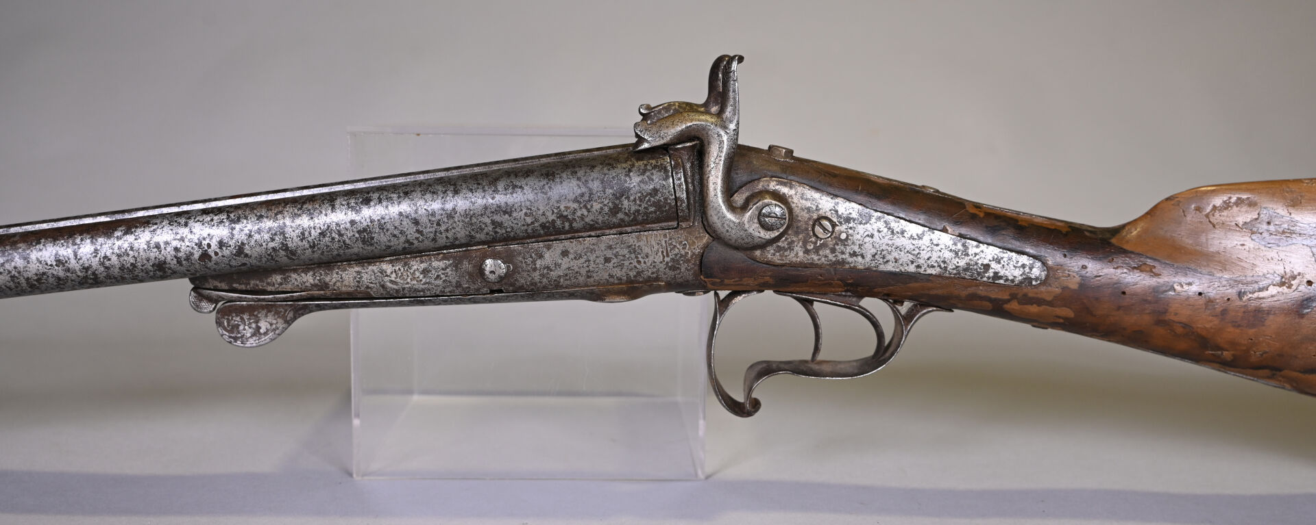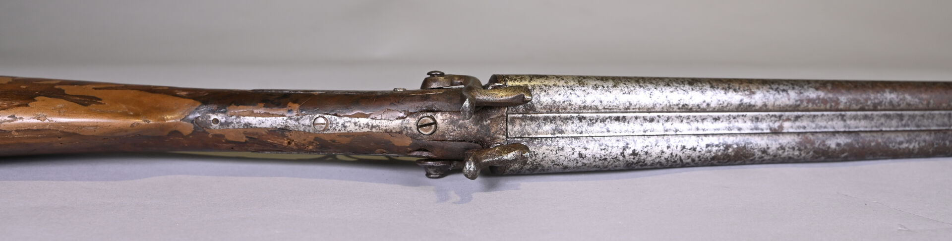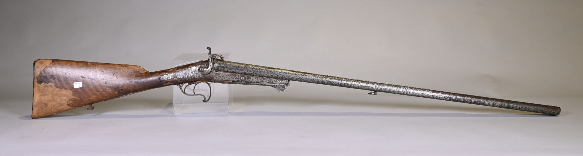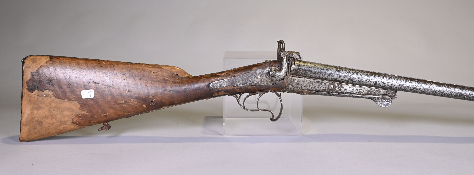 Fusil juxtaposé à broches systeme LE FAUCHEUX. Peau d’orange généralisée, crosse réparée à la patte à bois.