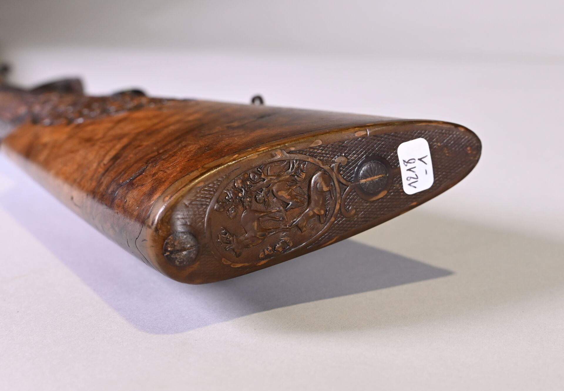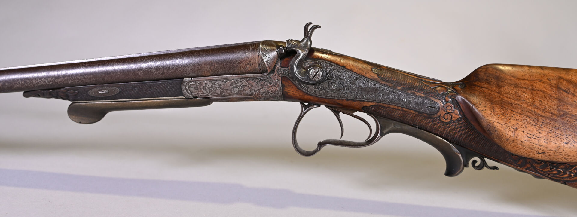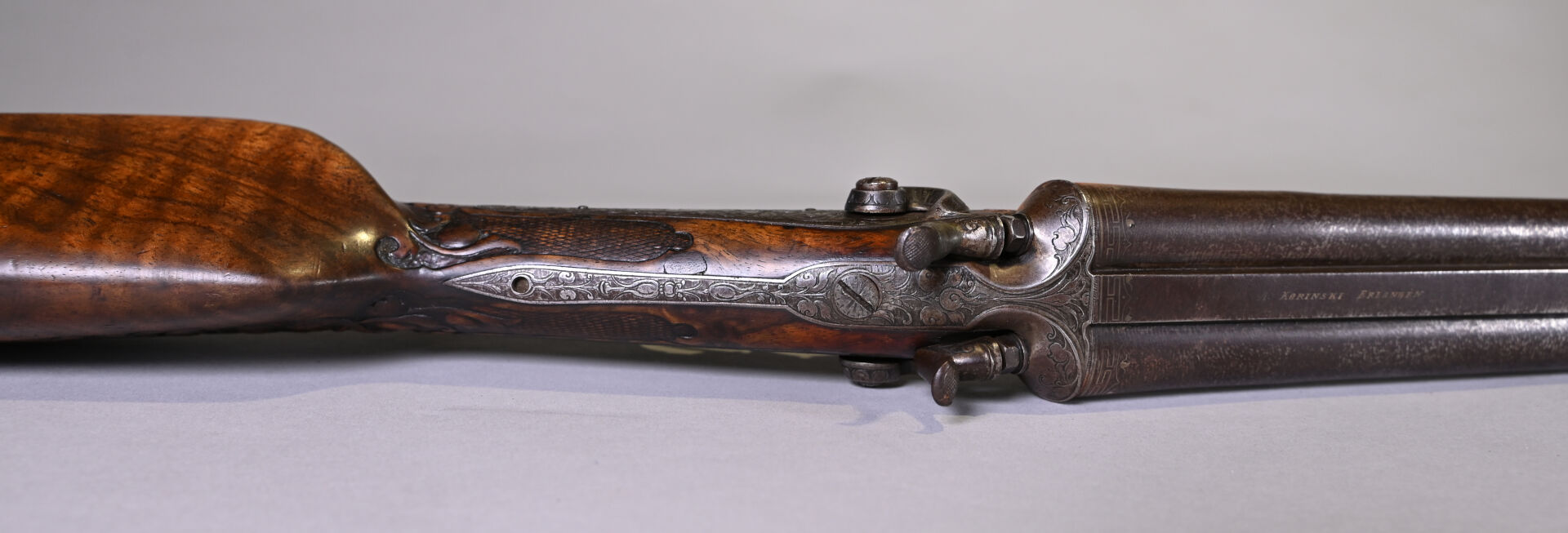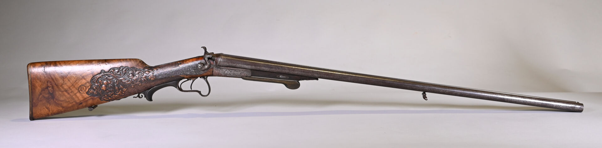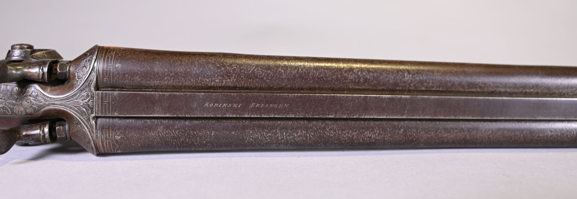 Fusil juxtaposé à chiens. Calibre 16.65 par Korinski à Erlangen. Arme numéro 4554, canon en damas filé couleur chocolat. Verrouillage type Le Faucheux. Garnie profondément gravé de scènes cynégétiques (chiens au rapport, sarabande de lièvres, renards). Devant monté à tiroir, bras d’ouverture et arrière pontet en corne blonde. Crosse anglaise à joue à gauche, sculptée de scènes cynégétiques sur la gauche et de volutes de feuillages à droite. Première détente tendeur, crête de chien ressoudée à gauche. Mécanisme fonctionnel. État 1. Allemagne, fin XIXe siècle. Intérieur des canons légèrement oxydé.