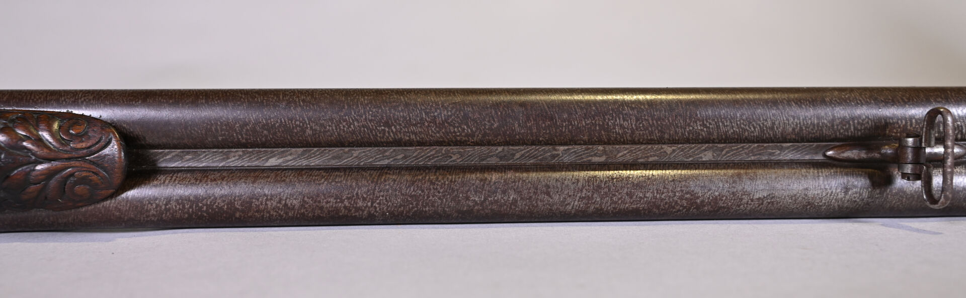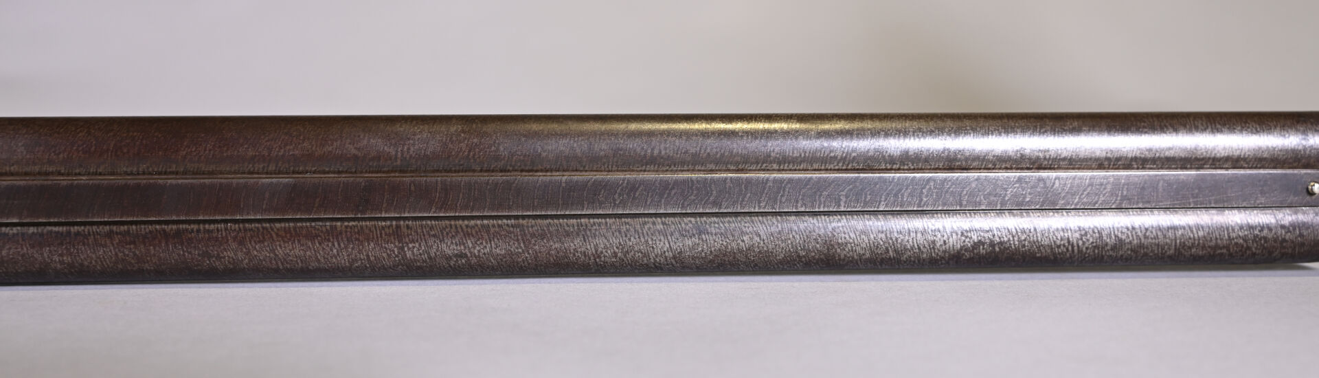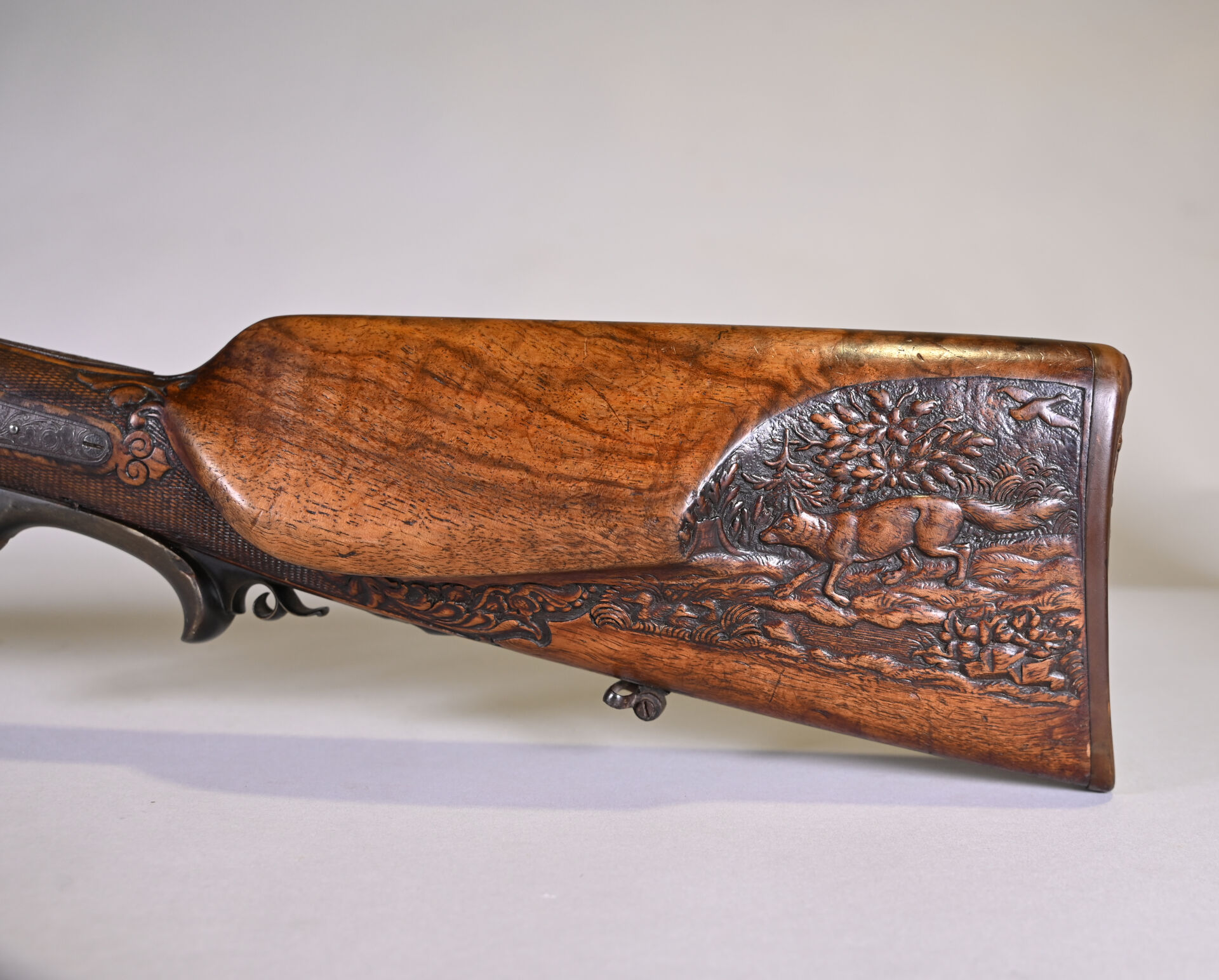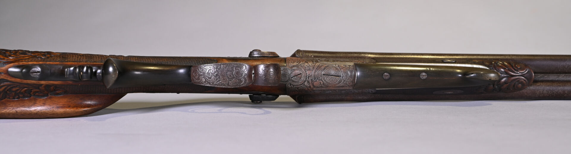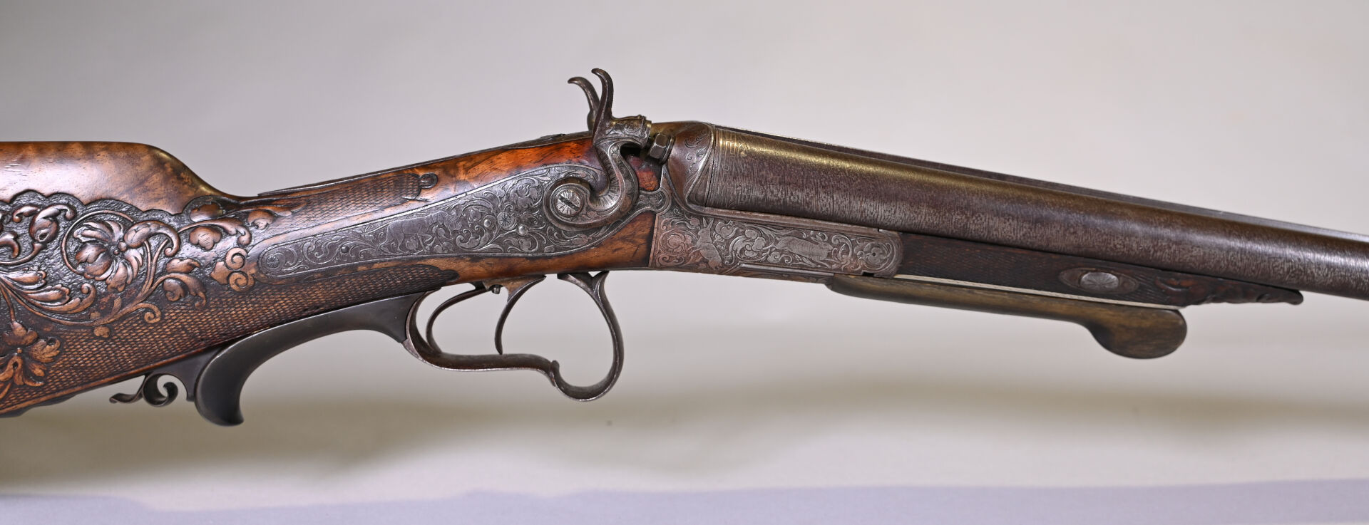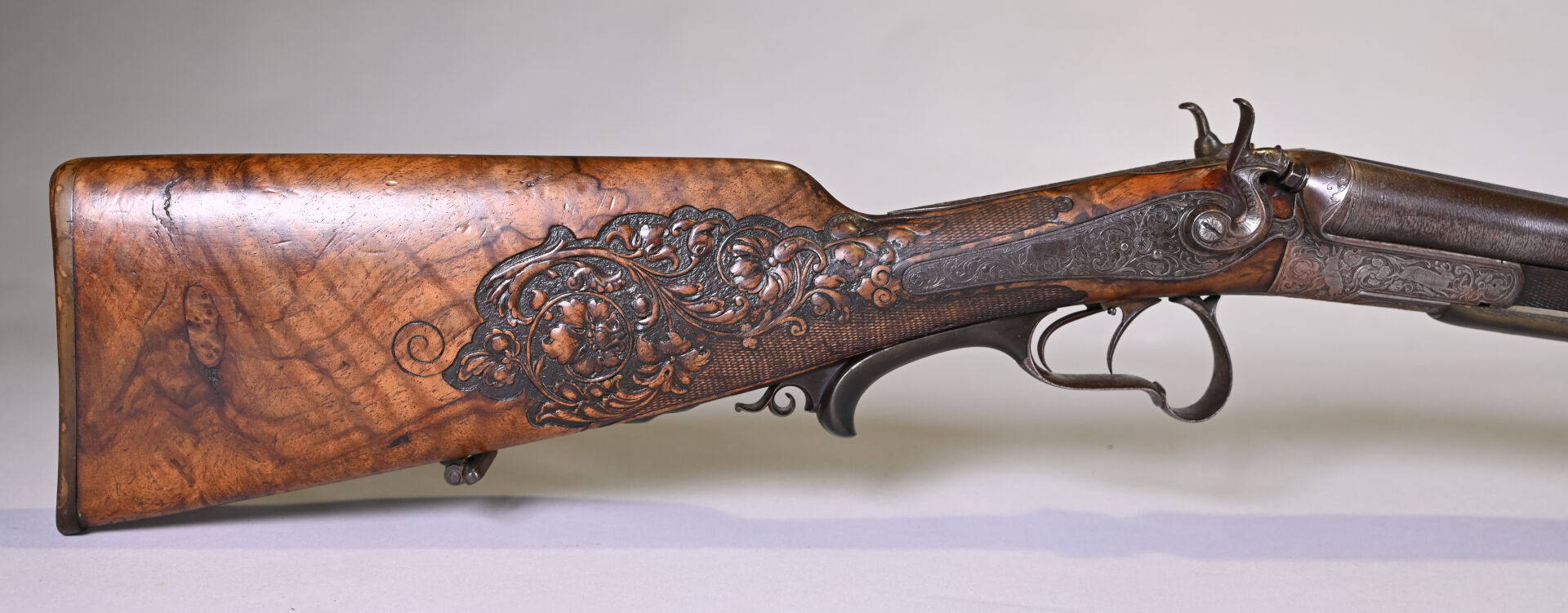 Fusil juxtaposé à chiens. Calibre 16.65 par Korinski à Erlangen. Arme numéro 4554, canon en damas filé couleur chocolat. Verrouillage type Le Faucheux. Garnie profondément gravé de scènes cynégétiques (chiens au rapport, sarabande de lièvres, renards). Devant monté à tiroir, bras d’ouverture et arrière pontet en corne blonde. Crosse anglaise à joue à gauche, sculptée de scènes cynégétiques sur la gauche et de volutes de feuillages à droite. Première détente tendeur, crête de chien ressoudée à gauche. Mécanisme fonctionnel. État 1. Allemagne, fin XIXe siècle. Intérieur des canons légèrement oxydé.