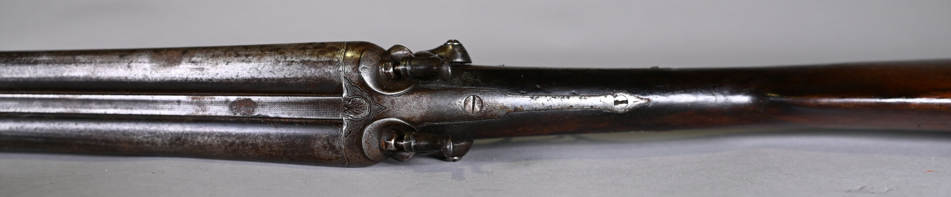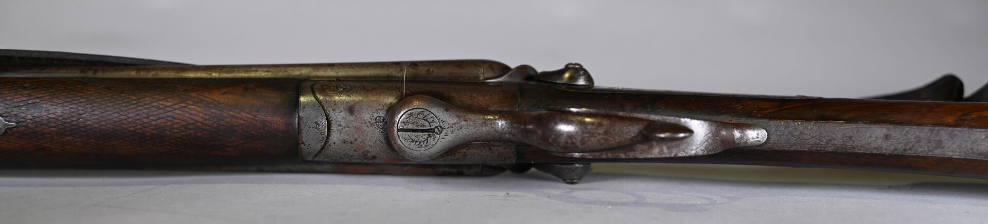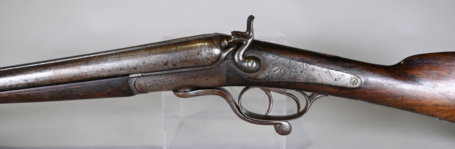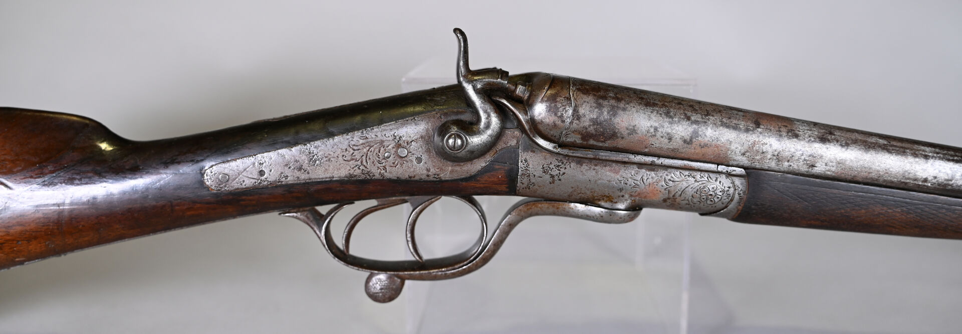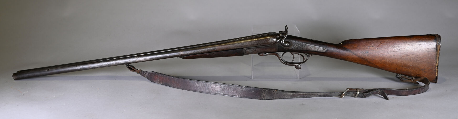 Fusil juxtaposé à chiens extérieurs calibre 1665. Ouverture par clé sous le pontet. Canon lisse de 700 mm. de long. Devant fixe, mécanisme fonctionnel à vide. Pas d’enclouage des percuteurs. Crosse anglaise de 360 mm. de long. Monture fer. État 2-. Cat D.