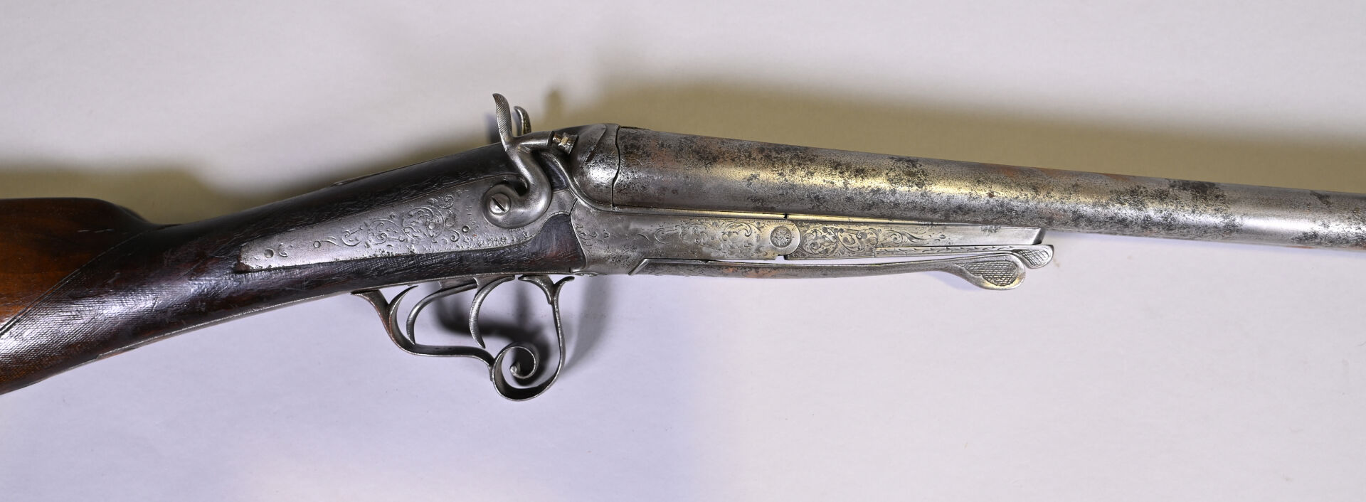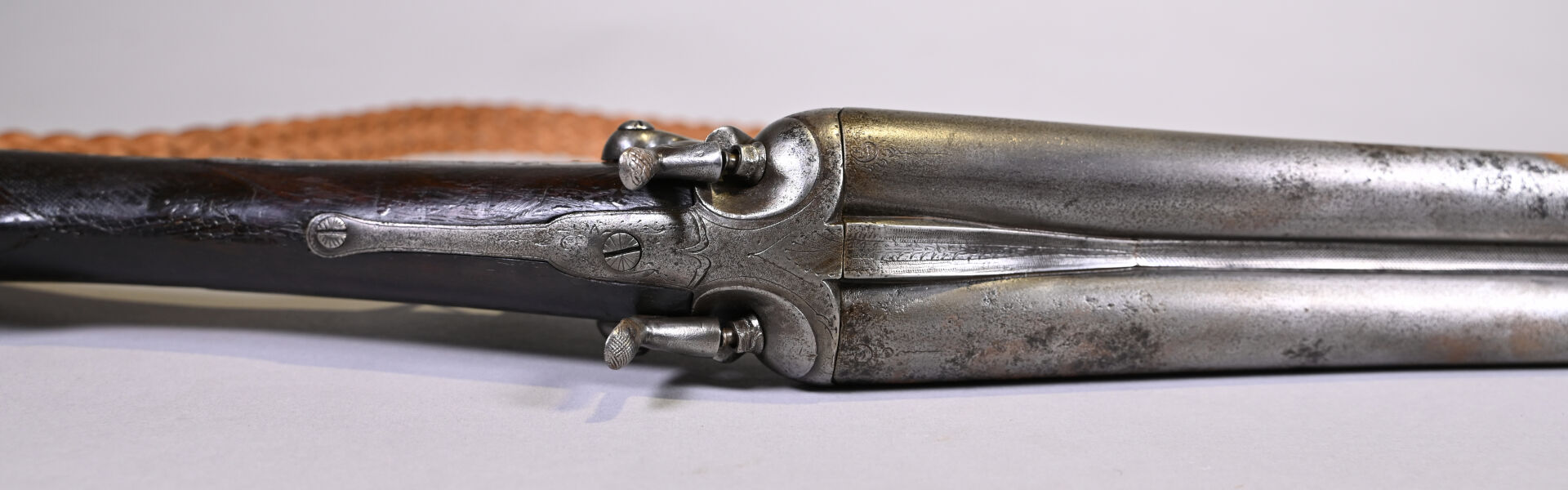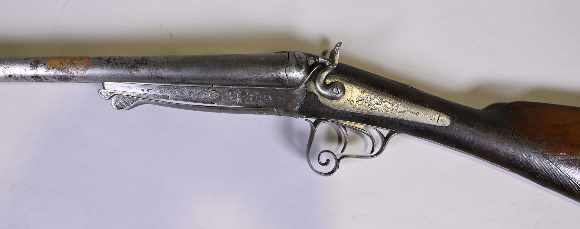 Fusil juxtaposé à percussion centrale, et ouverture par clef Le Faucheux, par J Labrosse à Dijon. Bande plongeante, platine à l’arrière, pontet à volutes, crosse anglaise. Mécanisme fonctionnel. Enclouage à gauche. Vis avant du pontet changé. Arme de catégorie D. Long : 114 cm. État 2 (quelques piqures minimes).