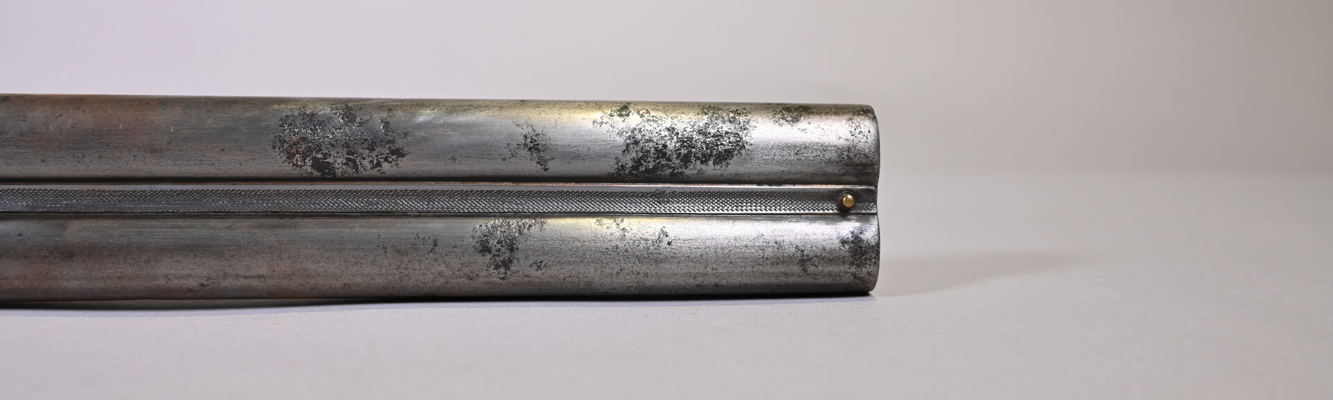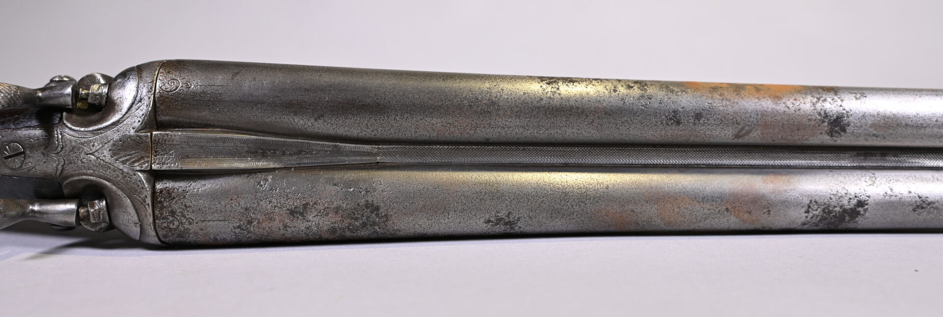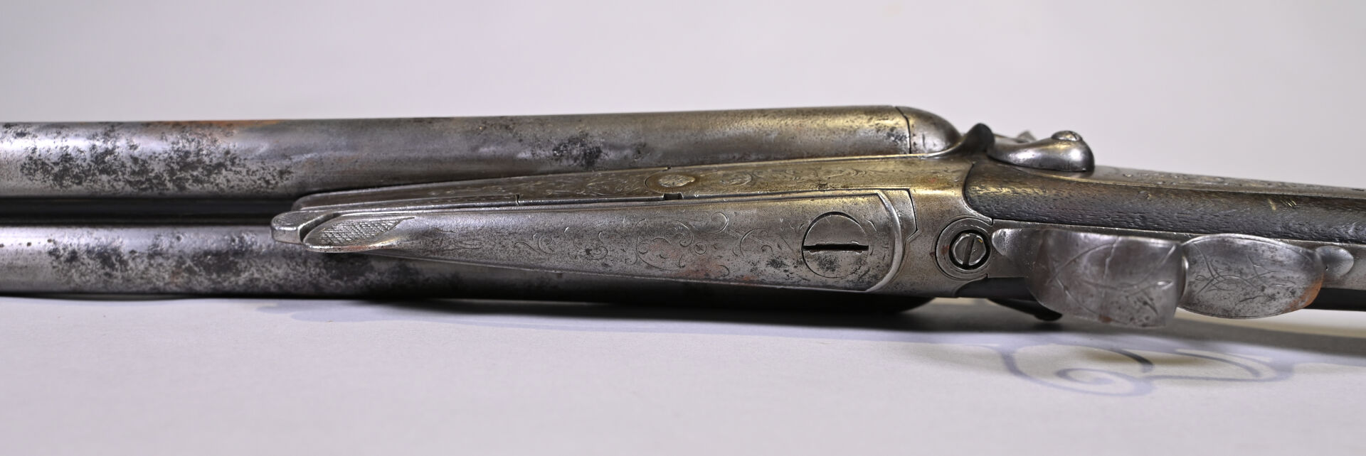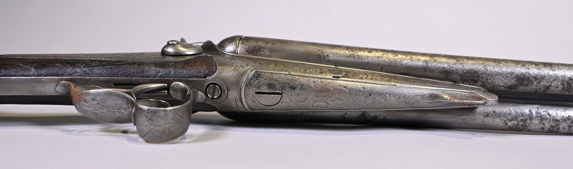 Fusil juxtaposé à percussion centrale, et ouverture par clef Le Faucheux, par J Labrosse à Dijon. Bande plongeante, platine à l’arrière, pontet à volutes, crosse anglaise. Mécanisme fonctionnel. Enclouage à gauche. Vis avant du pontet changé. Arme de catégorie D. Long : 114 cm. État 2 (quelques piqures minimes).