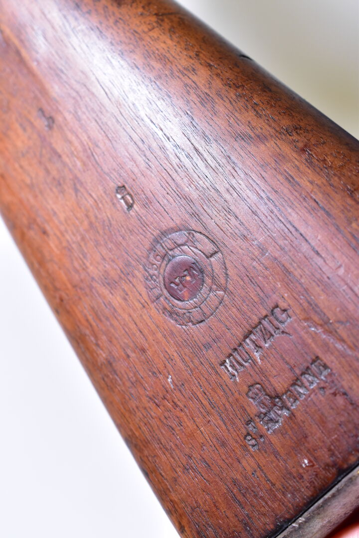 Fusil règlementaire français d’infanterie modèle 1822 Tbis issu de la transformation d’un fusil primitivement à silex de la manufacture royale de Saint-Etienne. Canon daté 1836. Avec une baguette. Belle monture en noyer blond marqué Saint-Etienne et Mutzig. Mécanisme fonctionnel. Manque vis de queue de culasse. Avec sa baïonnette. Cat. D. Etat 1.