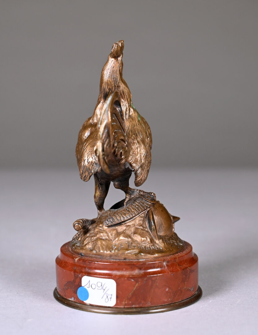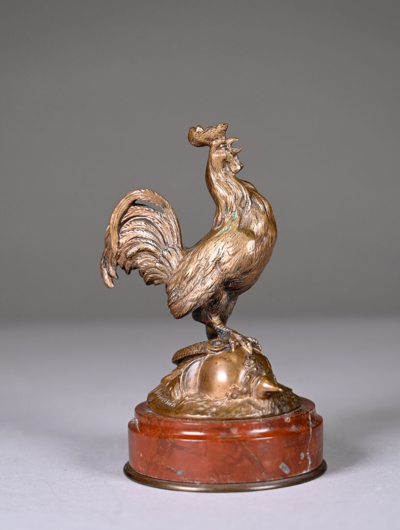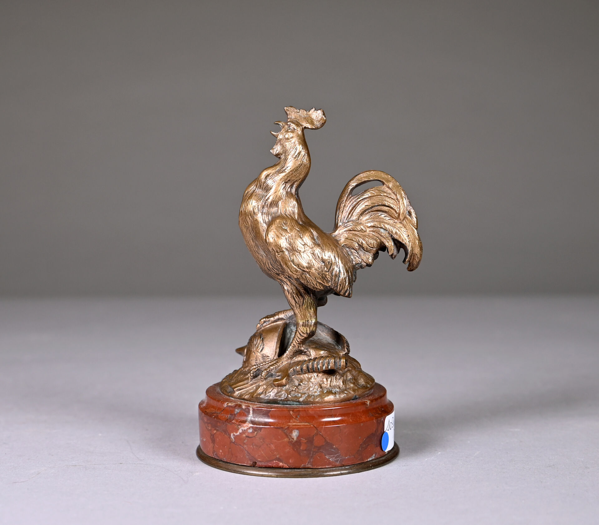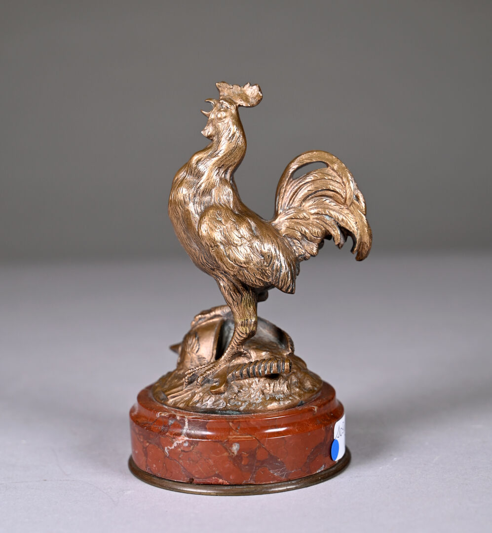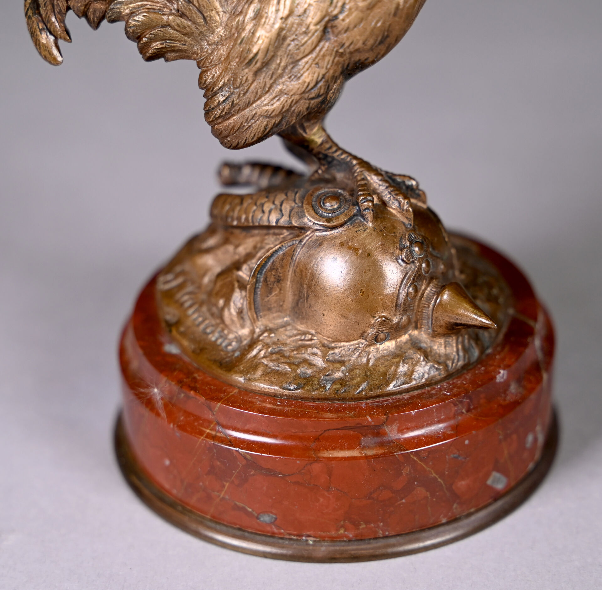 G. FLAMAND (1895-1925). Coq gaulois sur un casque à pointe en bronze patiné or. Signé sur la terrasse. Socle de marbre rouge. Haut. totale : 16,5 cm.