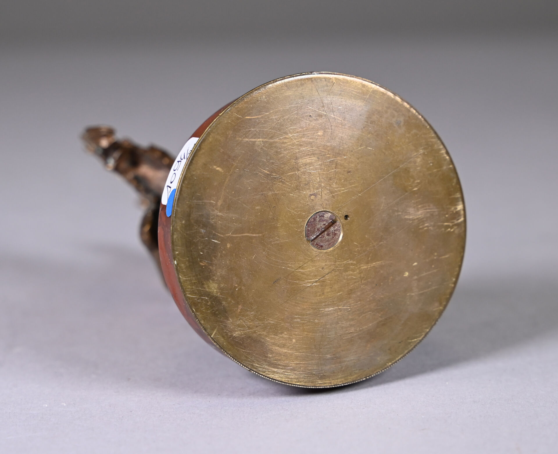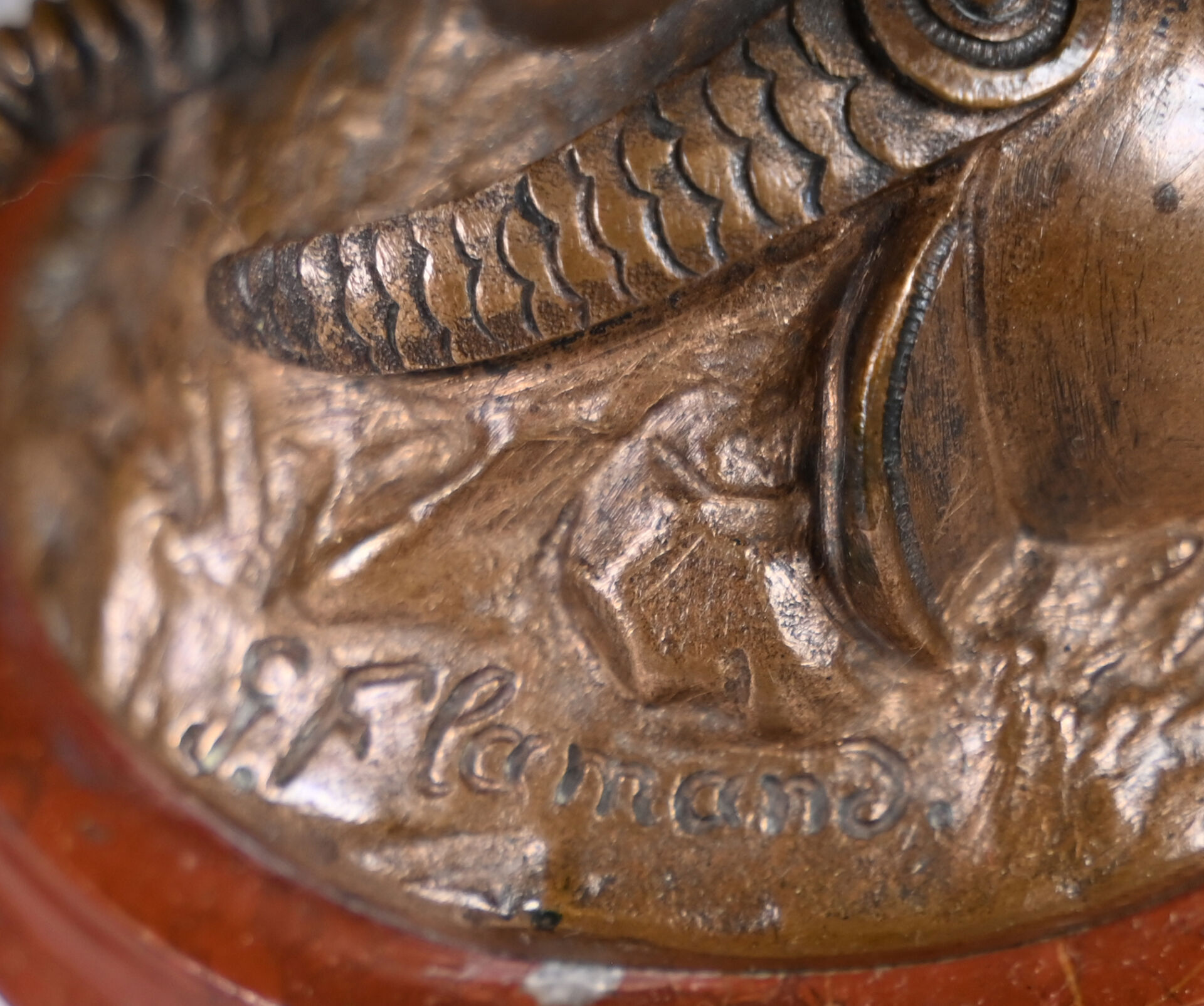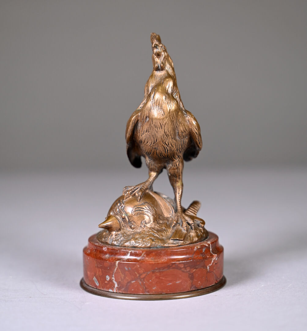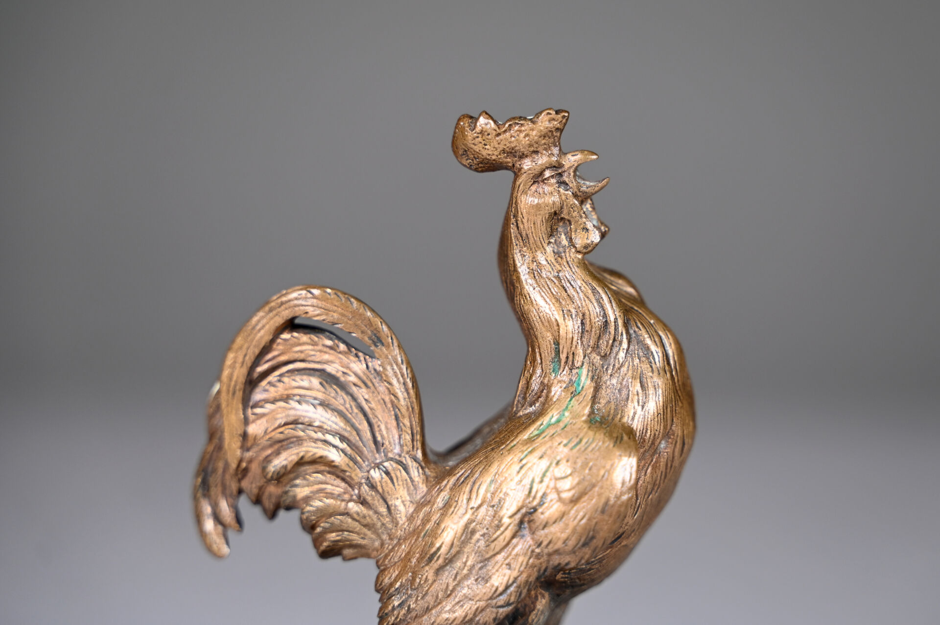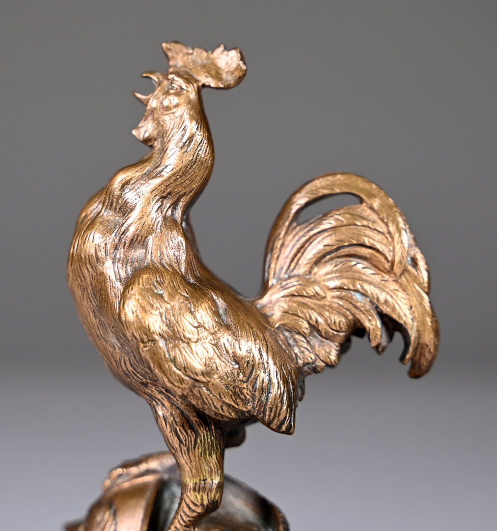 G. FLAMAND (1895-1925). Coq gaulois sur un casque à pointe en bronze patiné or. Signé sur la terrasse. Socle de marbre rouge. Haut. totale : 16,5 cm.